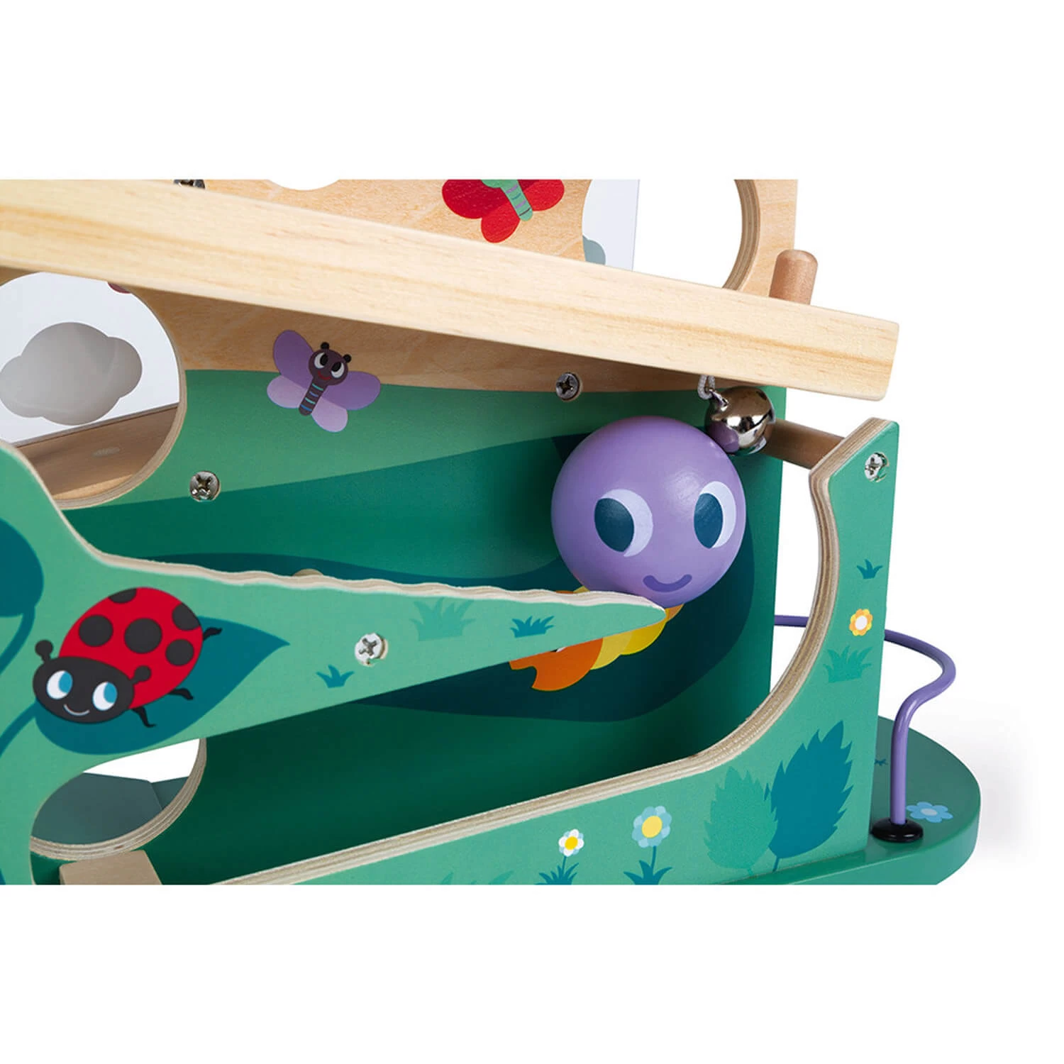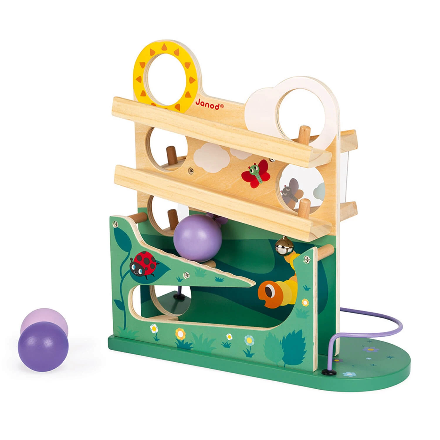 Un jeu tout en bois au décor coloré parfait pour l’éveil des tout-petits à partir de 12 mois et qui garantit des heures d’amusement ! Ce joli descendeur en bois est équipé de 3 balles qui passent dans le soleil et les nuages puis dans le tunnel transparent. Au passage, elle font tinter la clochette puis atterrissent dans le jardin en formant une chenille. Les enfants vont adorer regarder les balles descendre à toute allure le long du parcours !