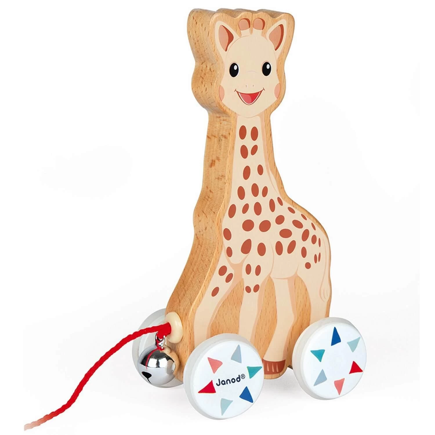 Ce magnifique jouet à promener en bois représentant Sophie la Girafe est équipé d’une petite corde rouge et d’un grelot pour que votre enfant puisse emmener son amie partout avec lui.