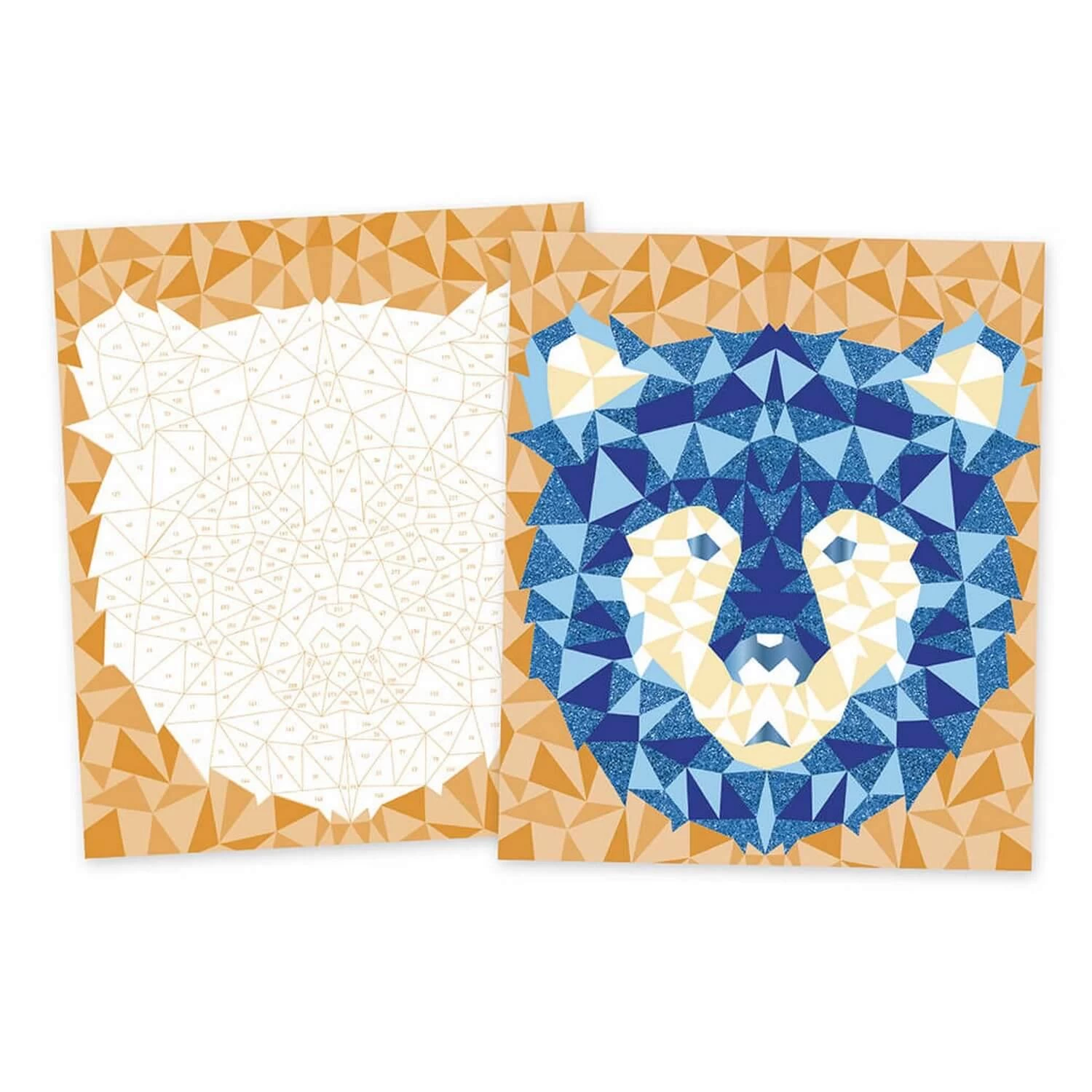 Dans ce kit, 6 planches de stickers de couleurs donc 1 avec paillettes et 1 métallisée permettent de décorer chaque partie selon les indications du livret explicatif pas à pas. C’est très simple : il suffit de suivre les numéros pour placer la bonne mosaïque au bon endroit. Cette activité convient tout à fait aux plus petits comme aux plus grands qui veulent laisser parler leur créativité. Vous obtiendrez un résultat spectaculaire sur ces têtes d’ours et de loup grâce à l’effet 3D des mosaïques !