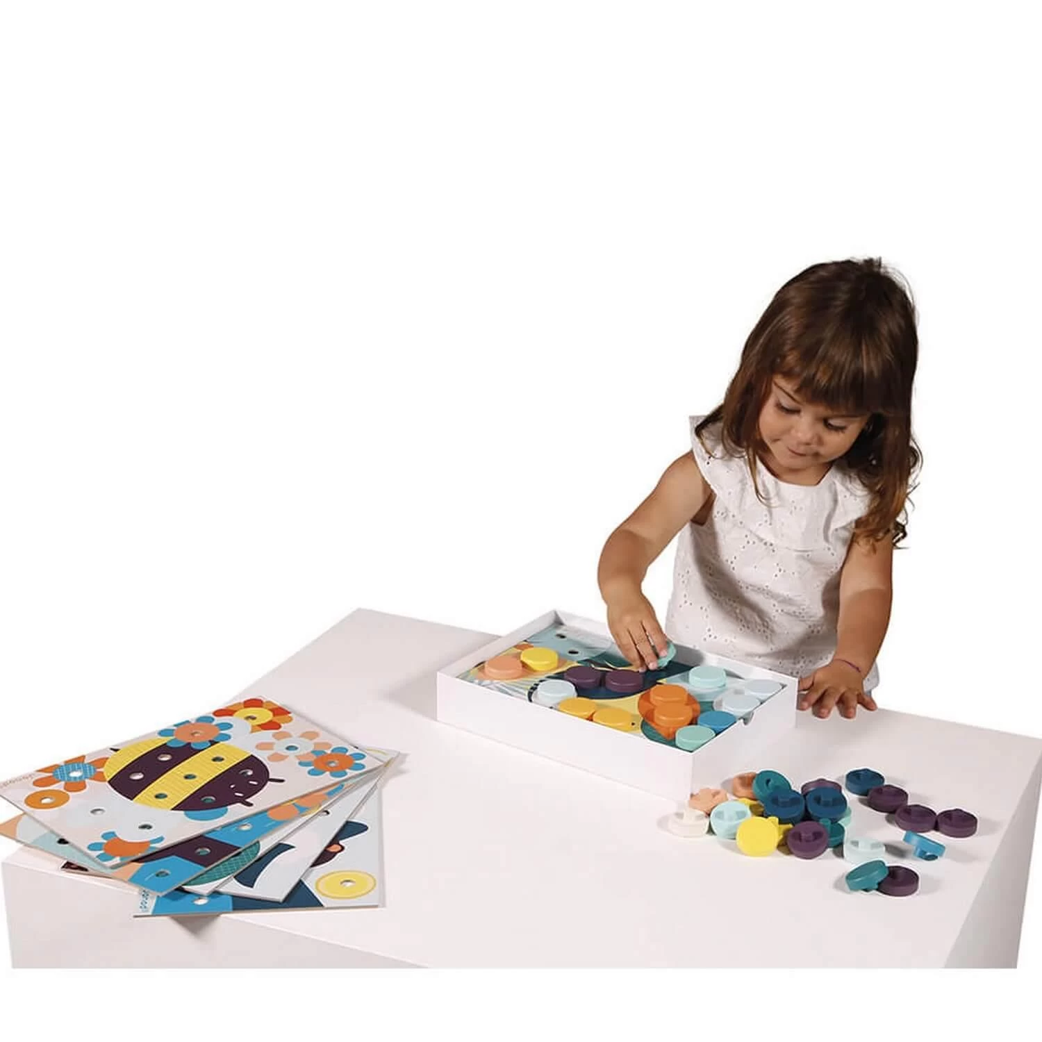 Pas besoin de colle, c’est une activité que les enfants prendront plaisir à recommencer encore et encore ! Un jouet d’éveil qui contient : 6 cartes perforées en carton et 38 pièces en bois.