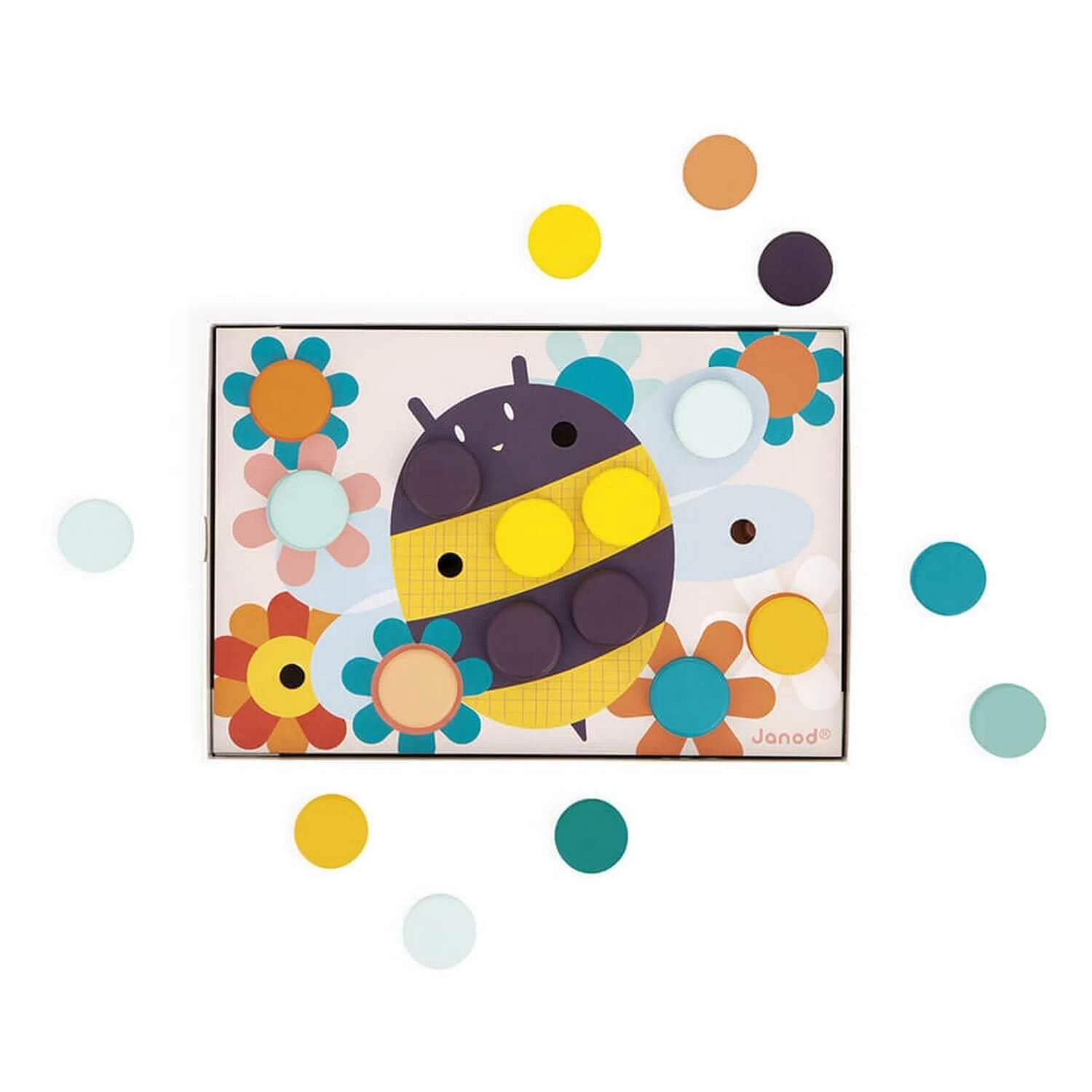 Destiné aux enfants dès 2 ans, ce kit de mosaïques en bois est idéal pour développer la motricité fine des petits, mais aussi pour l’apprentissage des couleurs ! Abeille, éléphant, baleine … De beaux tableaux au style printanier sont prêts à prendre vie au fur et à mesure que bébé place les pièces en bois au bon endroit. La taille des pièces est pensée pour les petites mains (3,6 cm de diamètre), pour une manipulation facile !