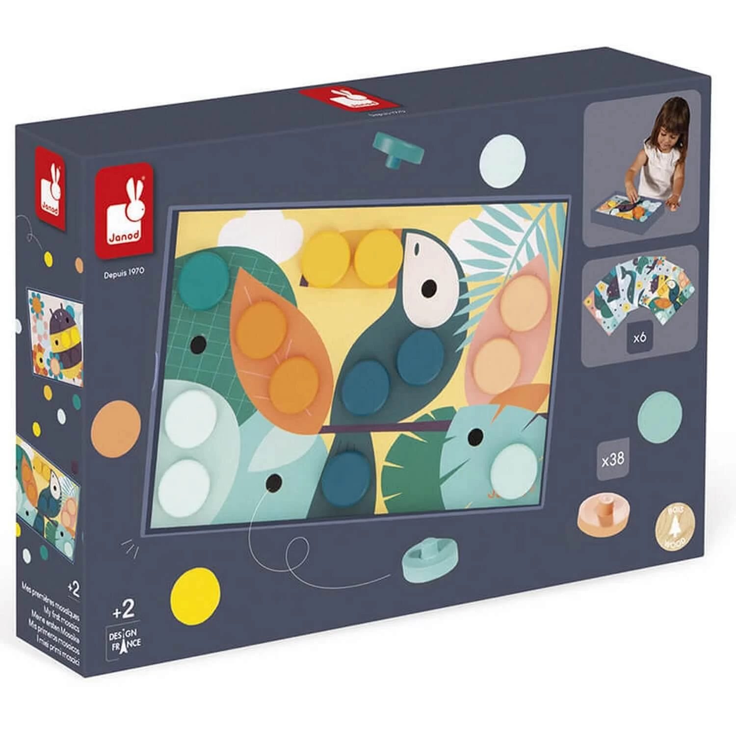 Les premières mosaïques de bébé ! Offrez à votre enfant un monde coloré avec ce set de pièces en bois et ces jolis tableaux à décorer.