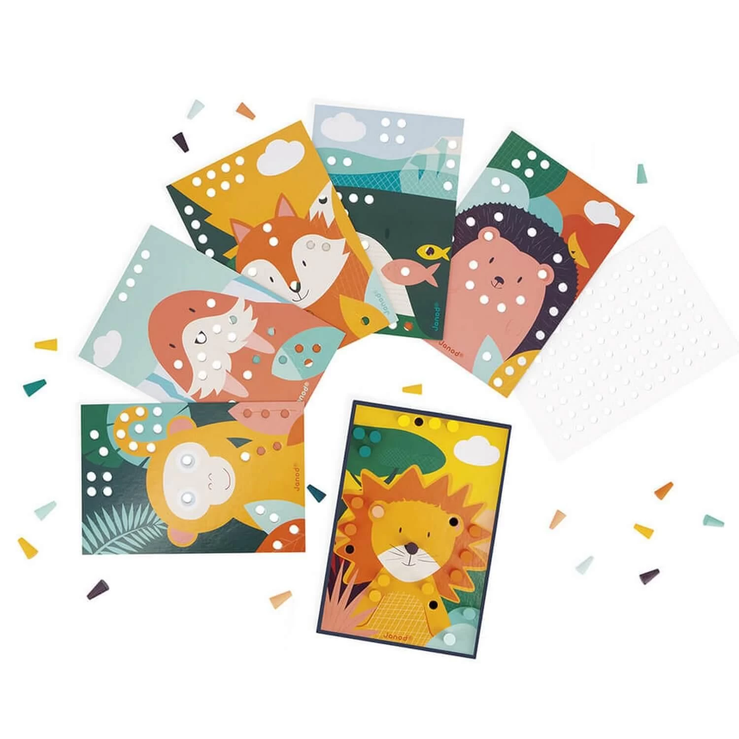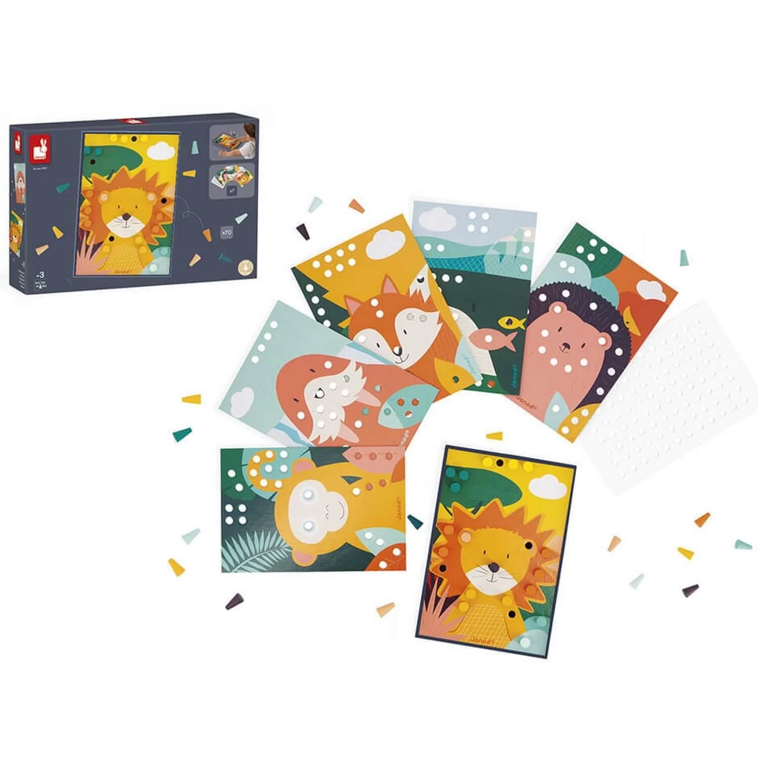 Les pièces ont été pensées pour les petites mains (1,5 cm de diamètre), pour une préhension facile ! Malin : la boîte sert de support pour les cartes, il n’y a plus qu’à poser et à décorer. Une activité créative et amusante, où les enfants apprendront les noms des animaux, les couleurs et aussi leurs nuances !