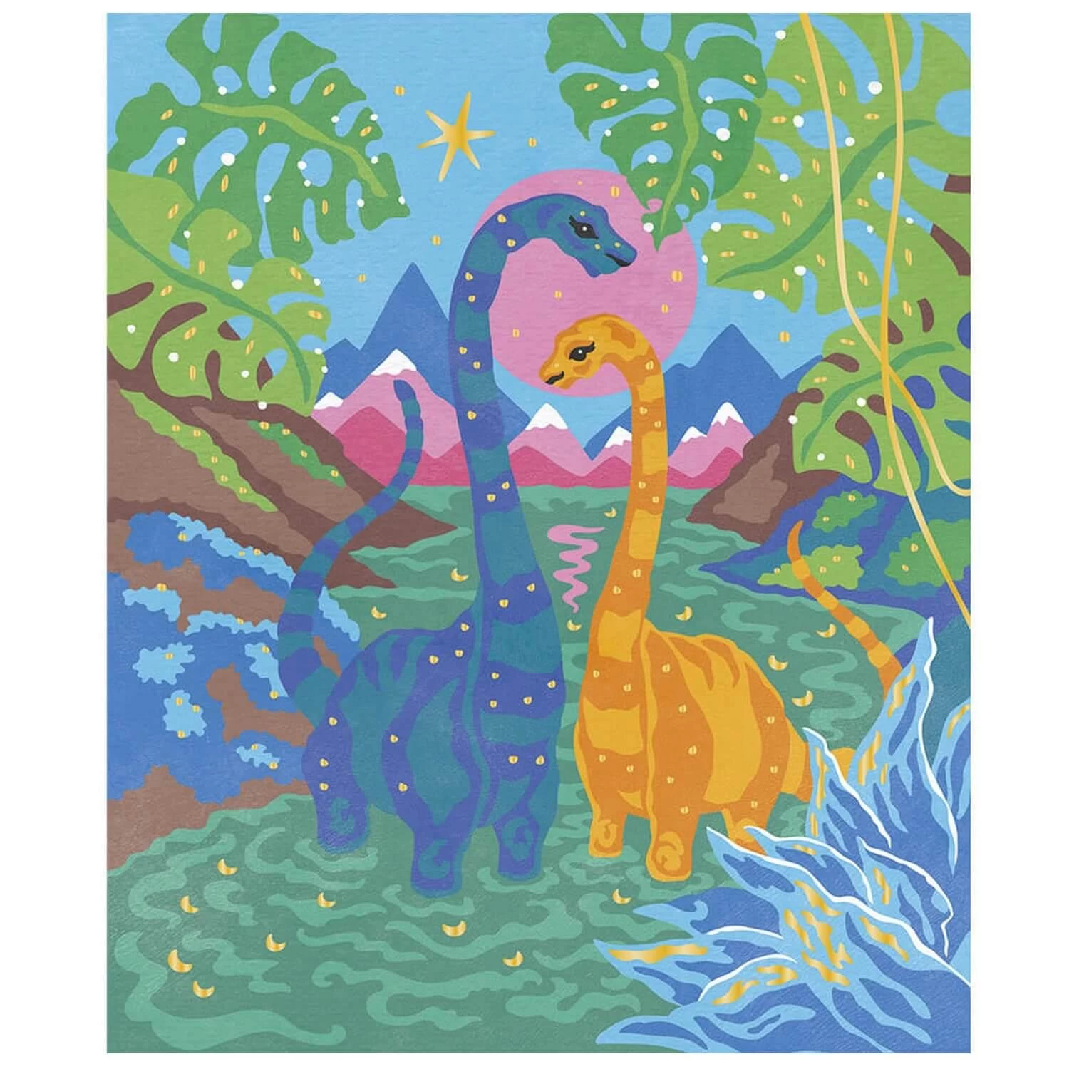 Comment réaliser un de ces superbes tableau ? Chaque couleur correspond à un numéro présent sur chaque zone du tableau à peindre. Ces zones sont délimitées par des contours, parfois dorés, qu’il ne faudra pas dépasser : les petits artistes verront apparaître à chaque coup de pinceau une illustration ou un décor digne des plus grands artistes ! Les petits créatifs seront occupés et concentrés pendant de longs moments, afin de donner vie à leurs créations. Peu à peu ils verront apparaitre deux diplodocus ou un tricératops. Ils seront fiers et satisfaits de montrer leurs tableaux préférés à toute la famille ! Il faudra environ 6 heures pour compléter ce beau tableau.