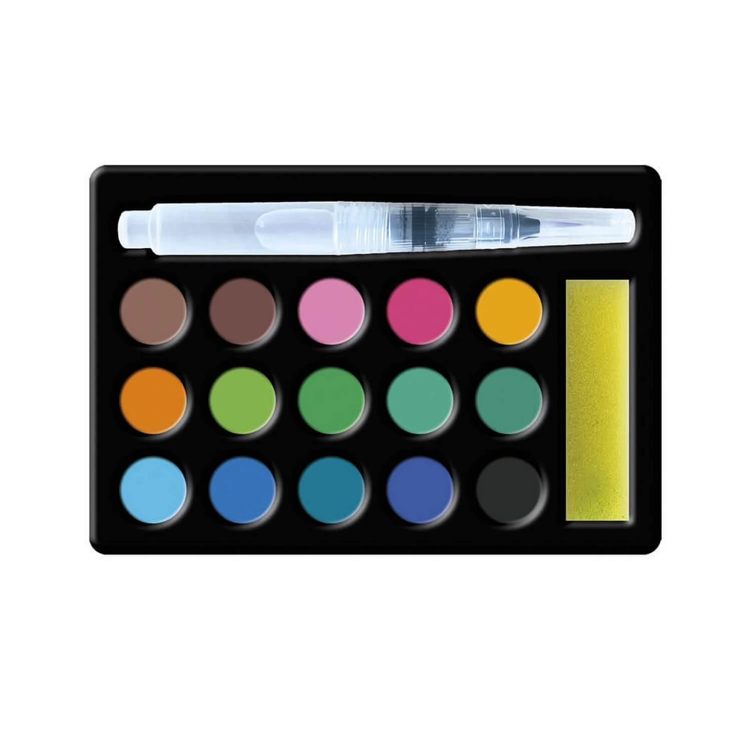 Contenu du coffret : 2 tableaux à peindre (dont 1 avec détails en dorure), 1 palette de peinture aquarelle (15 godets, 1 éponge, 1 feutre-pinceau avec réservoir d’eau), 1 cadre à peindre.