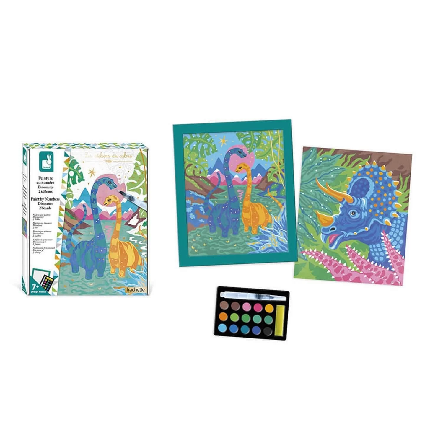 Découvrez ce coffret de peinture au numéro pour réaliser 2 tableaux sur le thème des Dinosaures de la marque Janod.