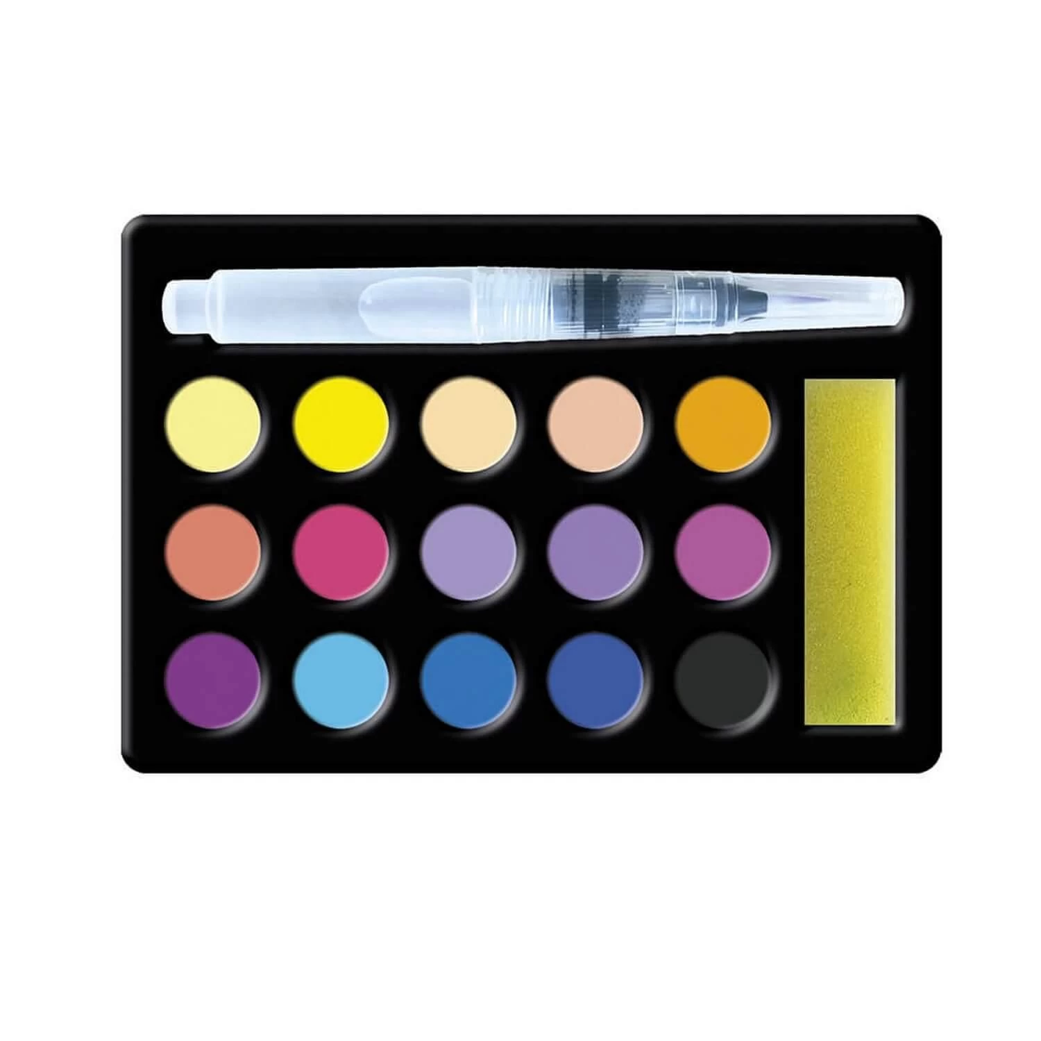 Contenu du coffret : 2 tableaux à peindre (dont 1 avec détails en dorure), 1 palette de peinture aquarelle (15 godets, 1 éponge, 1 feutre-pinceau avec réservoir d’eau), 1 cadre à peindre.