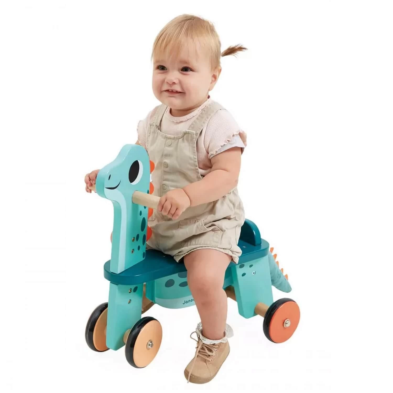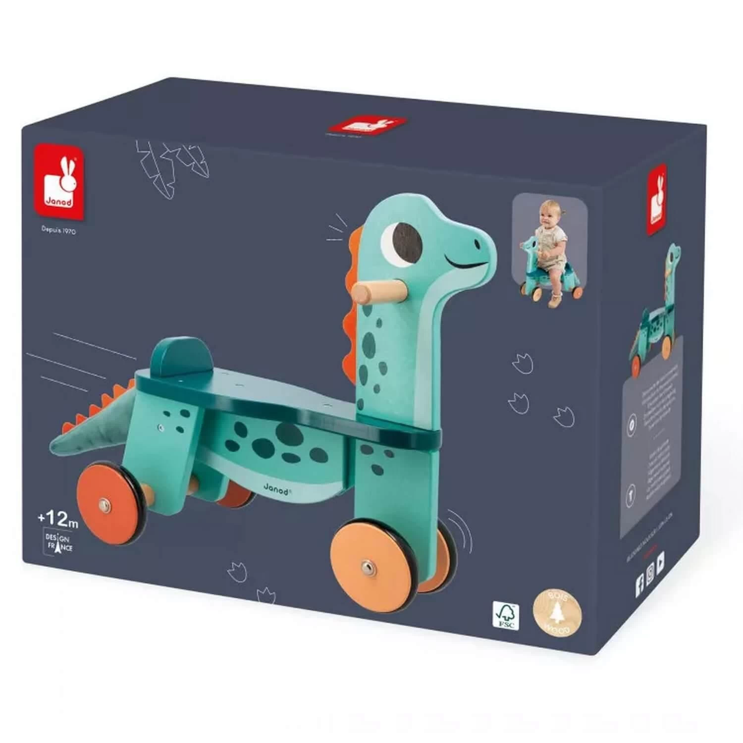 Dès 12 mois, proposez à votre enfant de développer sa motricité en utilisant un porteur en bois sur 4 roues très stables. Les 2 roues de l’avant bougent avec la tête du dino quand les enfants souhaitent tourner. Les 4 roues sont équipées de silicone afin d’avoir une conduite des plus silencieuses. La forme du siège (haut de 21 cm) permet aux enfants de monter facilement et d’être bien installés. Les poignées en bois naturel au niveau de la tête aideront les plus petits à se stabiliser pour partir à l’aventure en se poussant avec ses jambes !