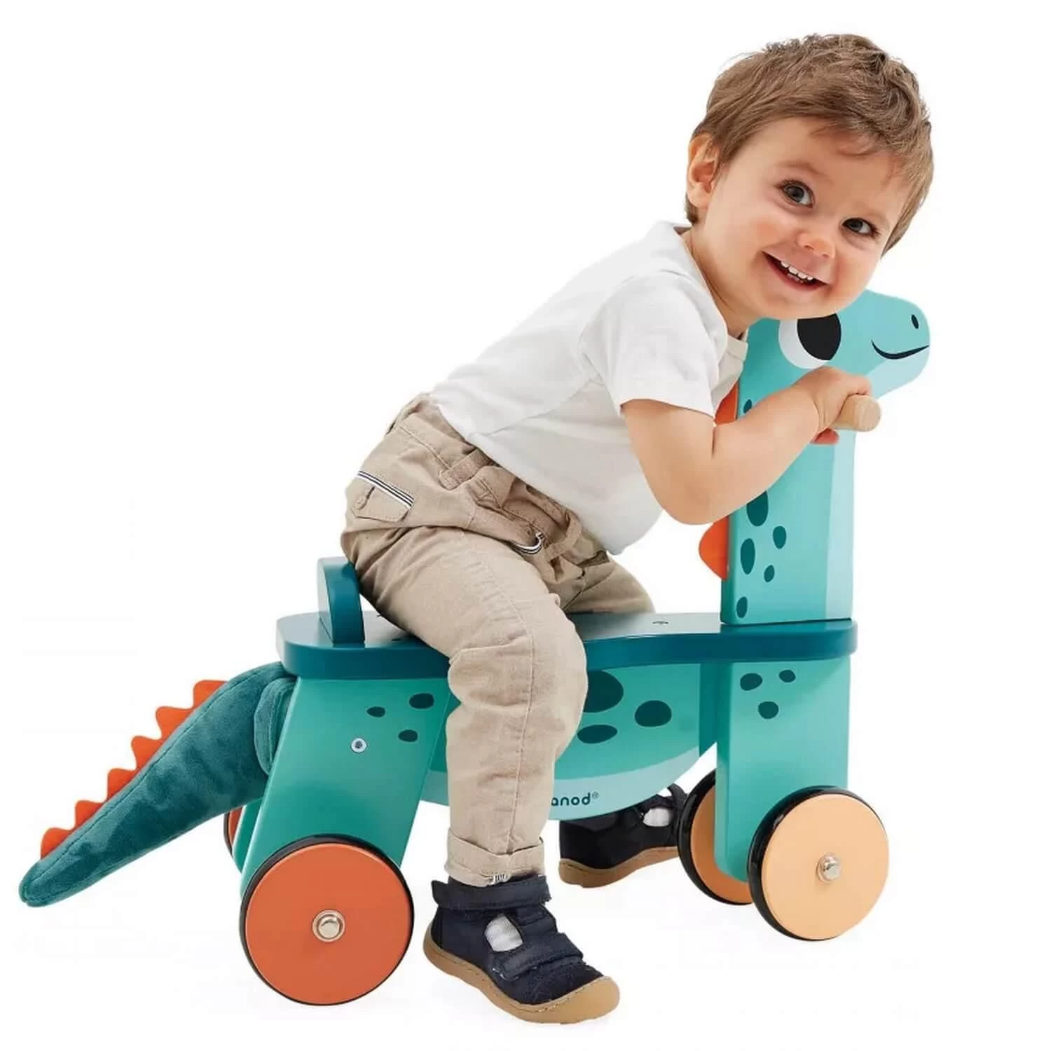 Et la surprise ? La queue du dinosaure est en peluche toute douce et permet d’apporter une touche rigolote à ce porteur ! Grâce à un scratch, elle est détachable pour être facilement nettoyée (lavable à froid à 30°C).