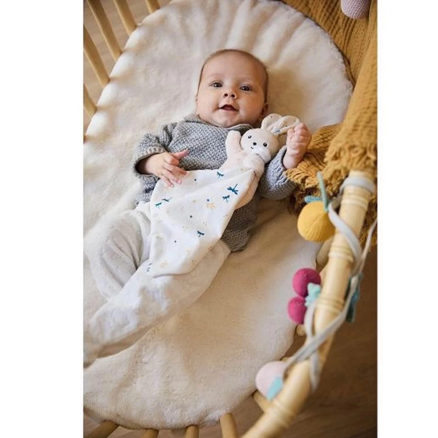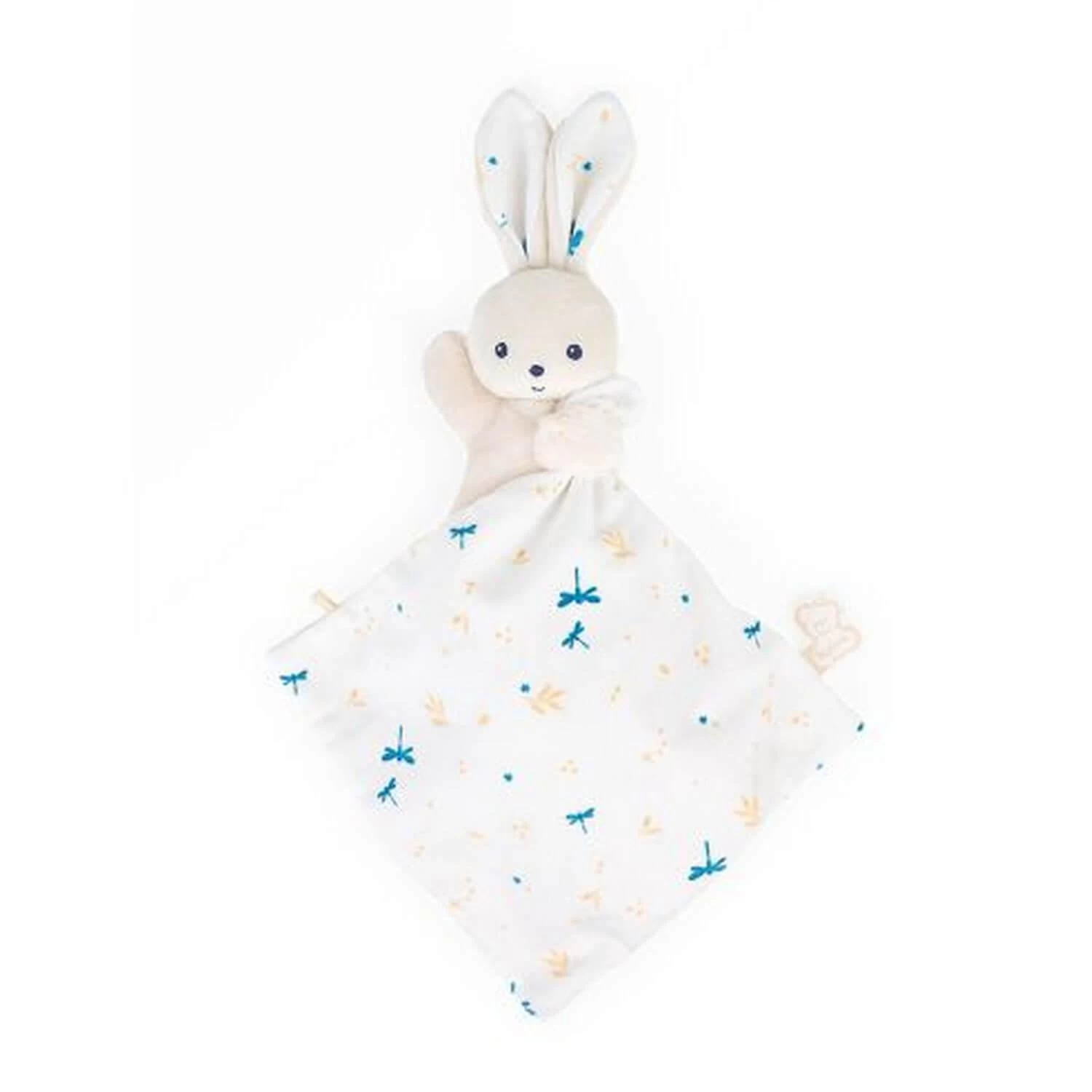 Ce doudou lapin enveloppé dans son carré de douceur sera le compagnon préféré de bébé. Avec son petit corps moelleux en micro-velours, le lapin est facile à agripper et à tenir par le corps ou ses longues oreilles. Le doudou plat blanc carré entre ses mains est habillé de petites libellules qui virevoltent bleues entre les brindilles dorées. Cet imprimé délicat et poétique se retrouve également dans les oreilles du lapin.