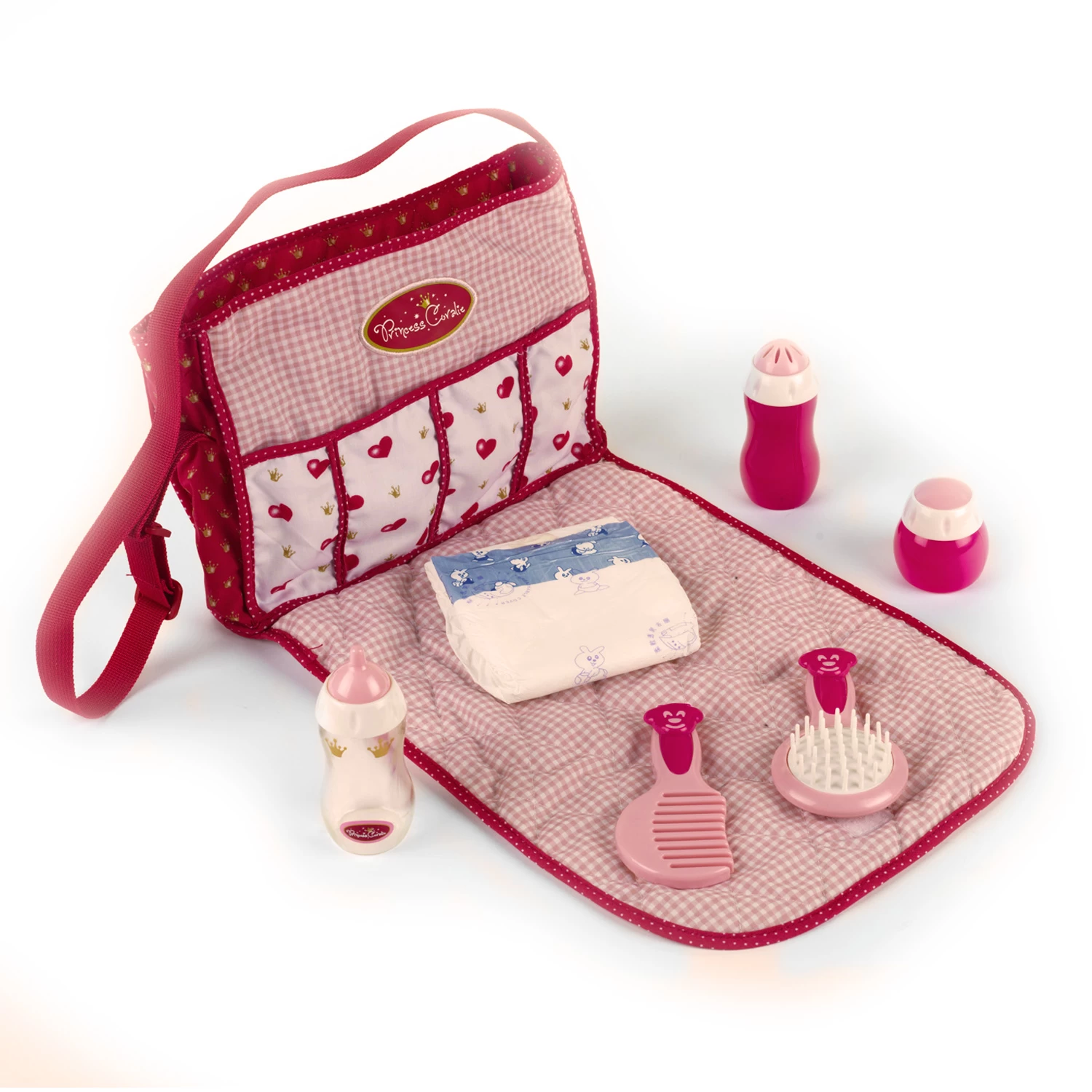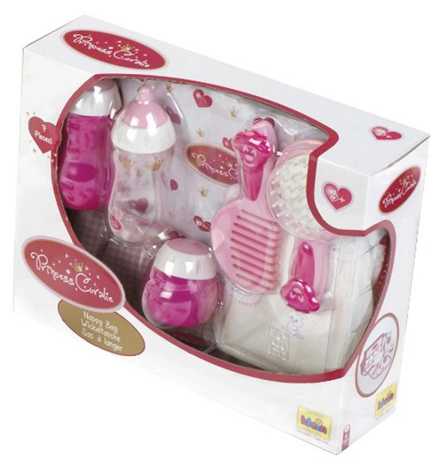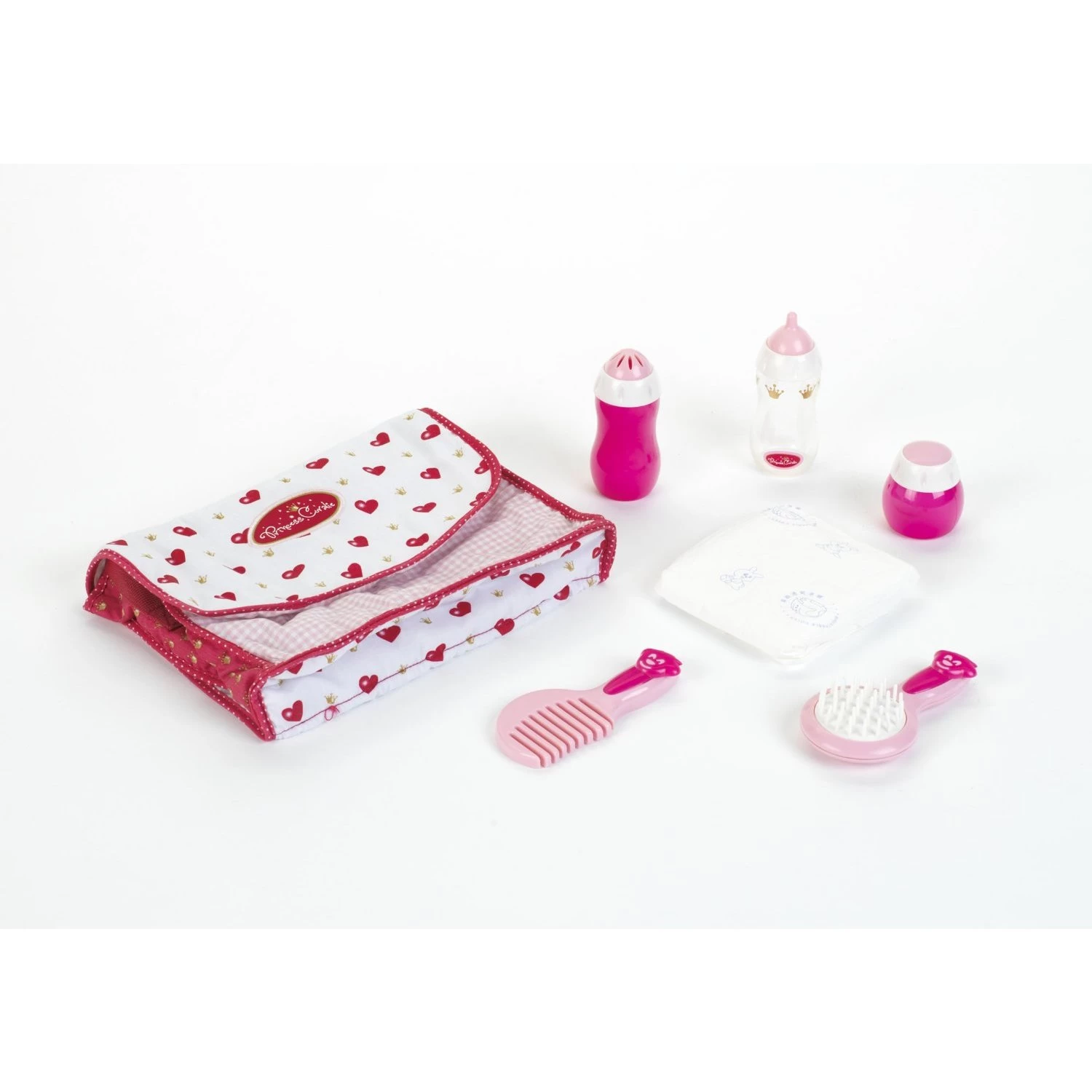 Fourni avec de nombreux accessoires de puériculture : biberon, brosse, peigne, couche et flacons de produits cosmétiques factices.