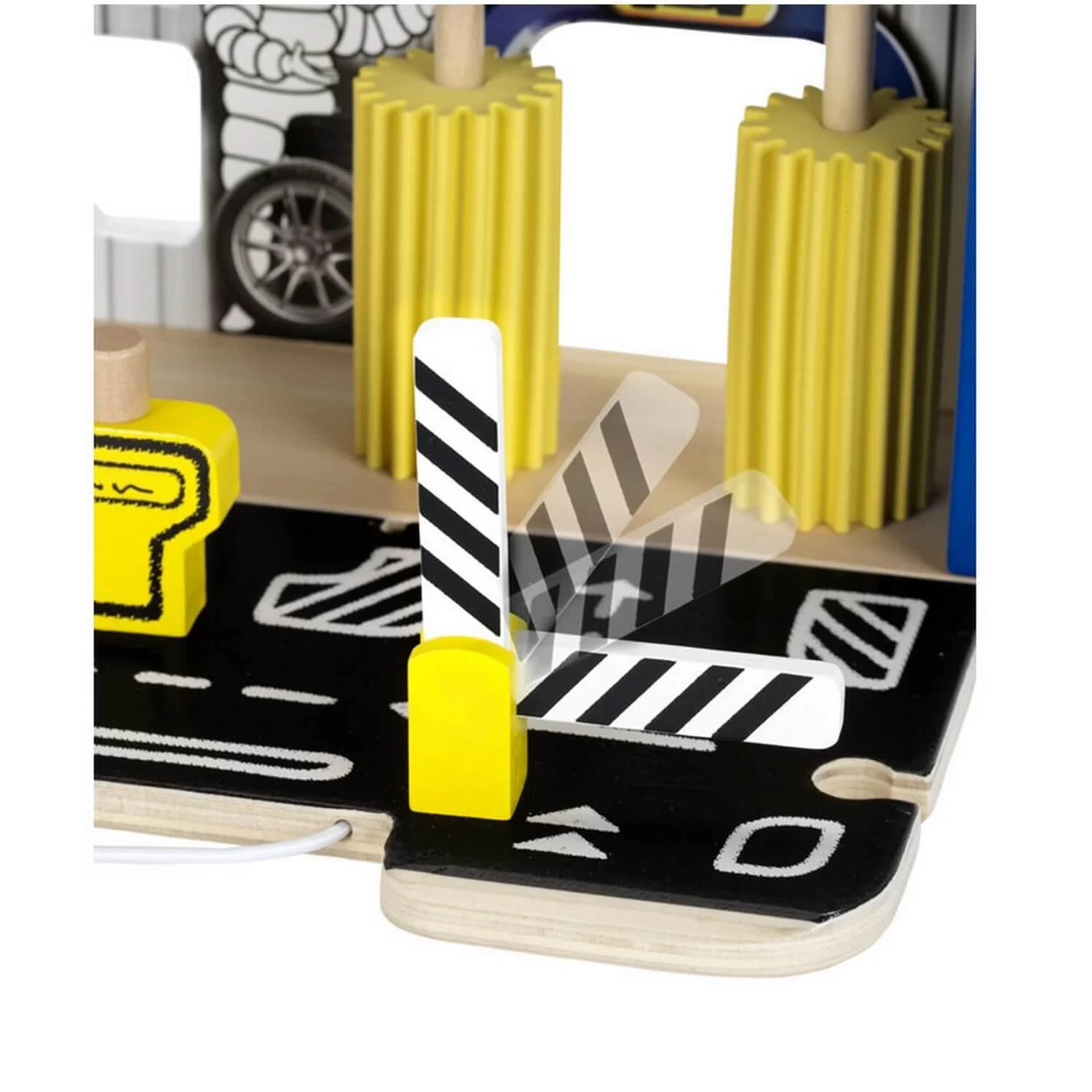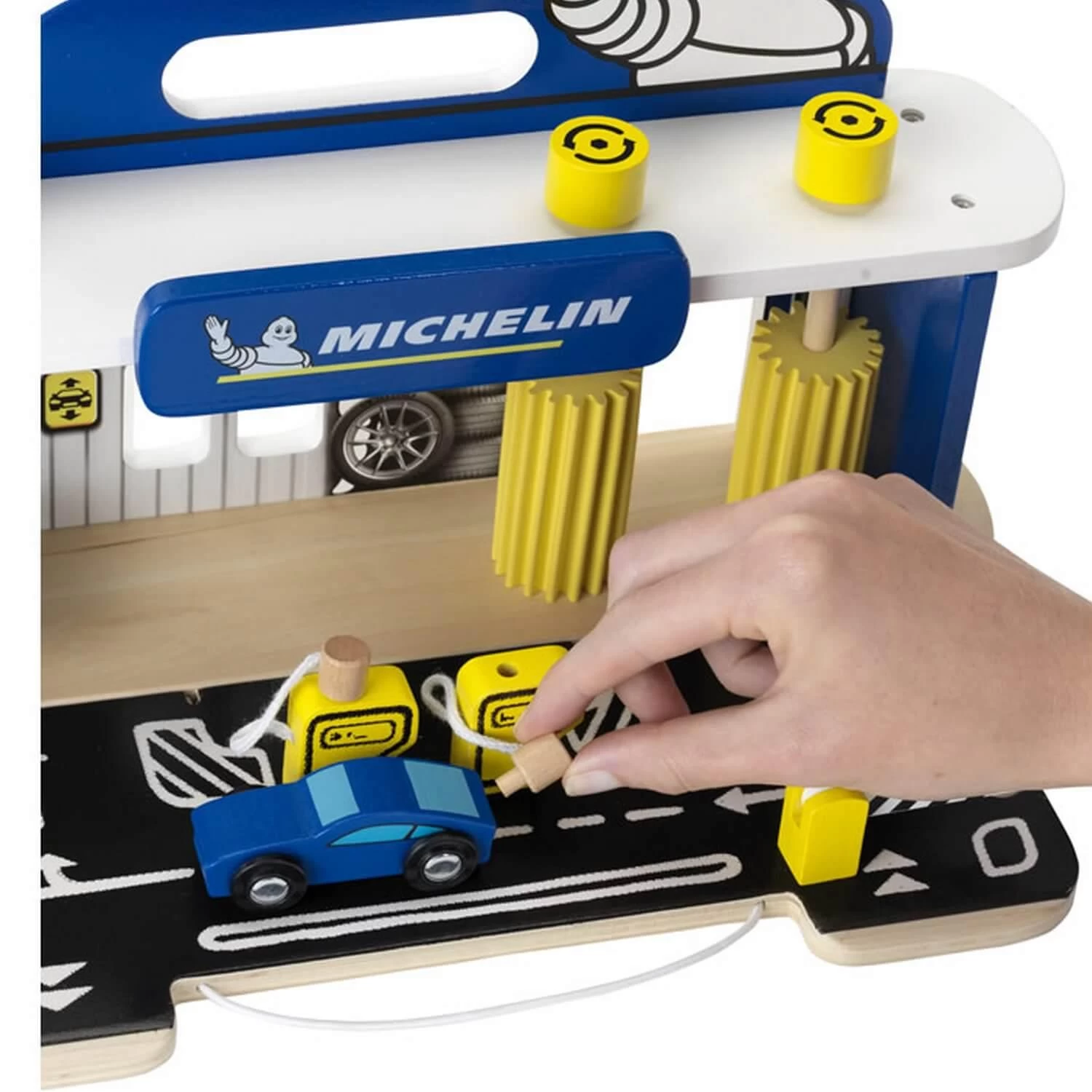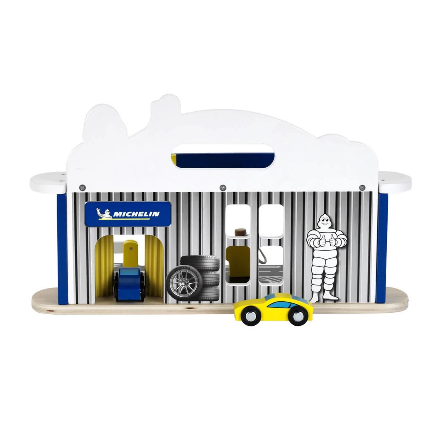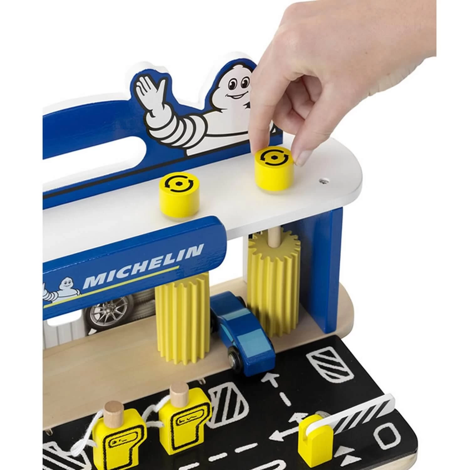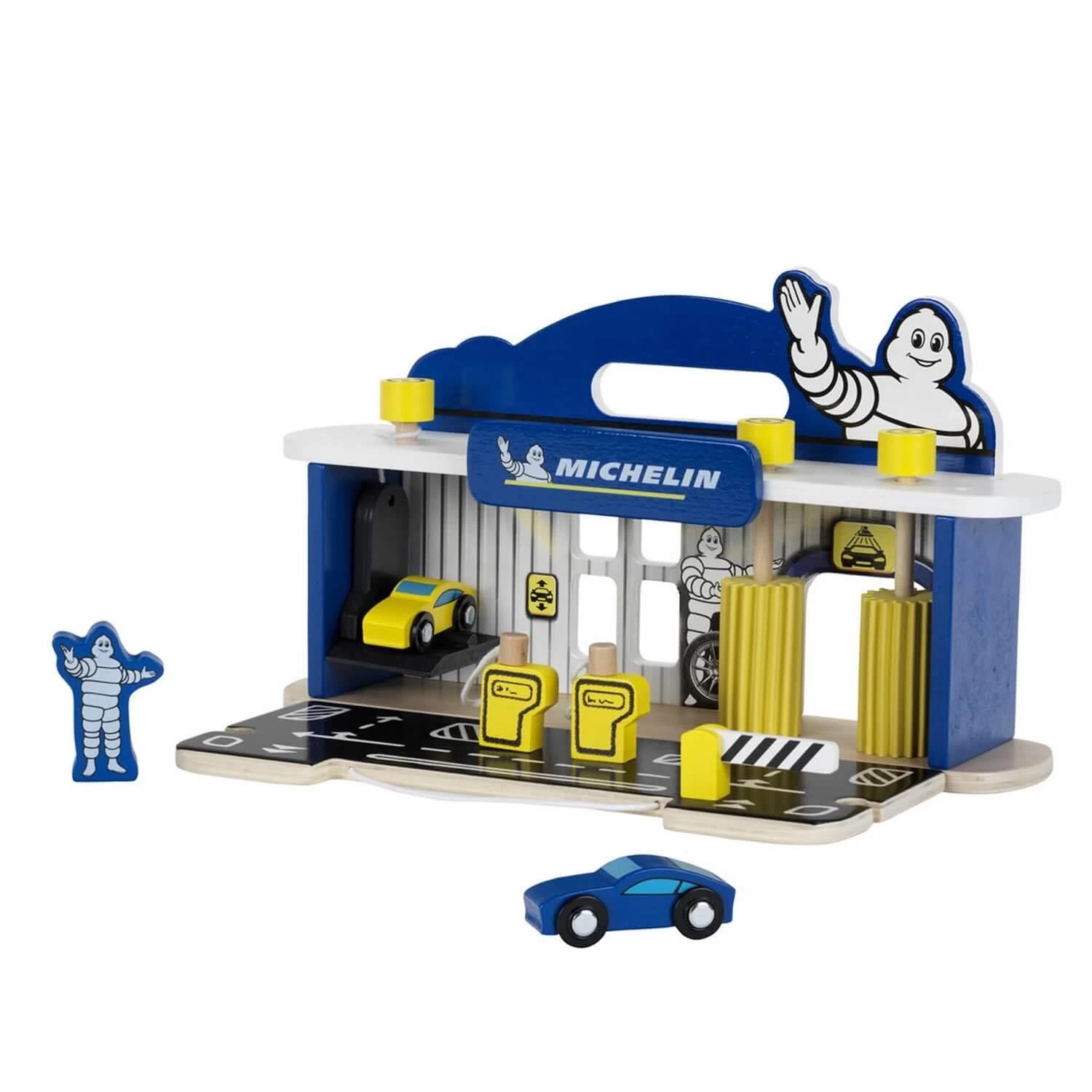 Simple et pratique, voilĂ comment rĂ©sumer les qualitĂ©s de cette station-service en bois pour enfants : la piste automobile situĂ©e devant le garage se replie et se fixe au panneau MICHELIN, ce qui permet dâemporter la station-service de partout.