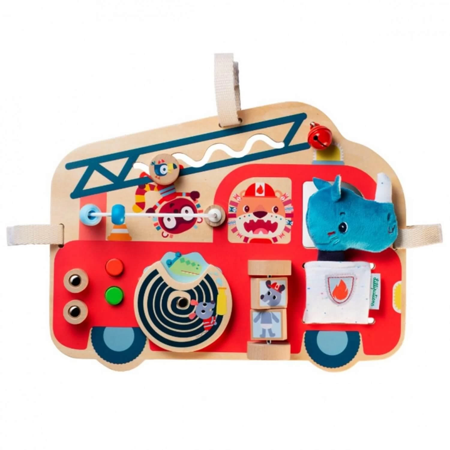 Que ce soit dans son lit ou partout ailleurs, votre petit va s’amuser avec ce camion de pompier canneau d’activités de la marque Lilliputiens.