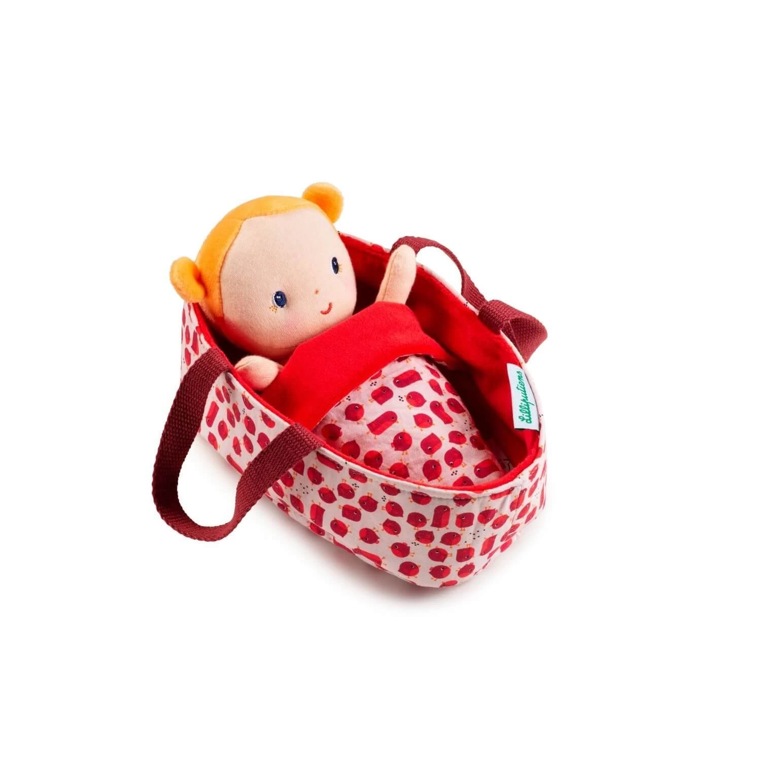 La poupée Agathe de Lilliputiens dans son ensemble rouge à motif d’oiseau est adorable.