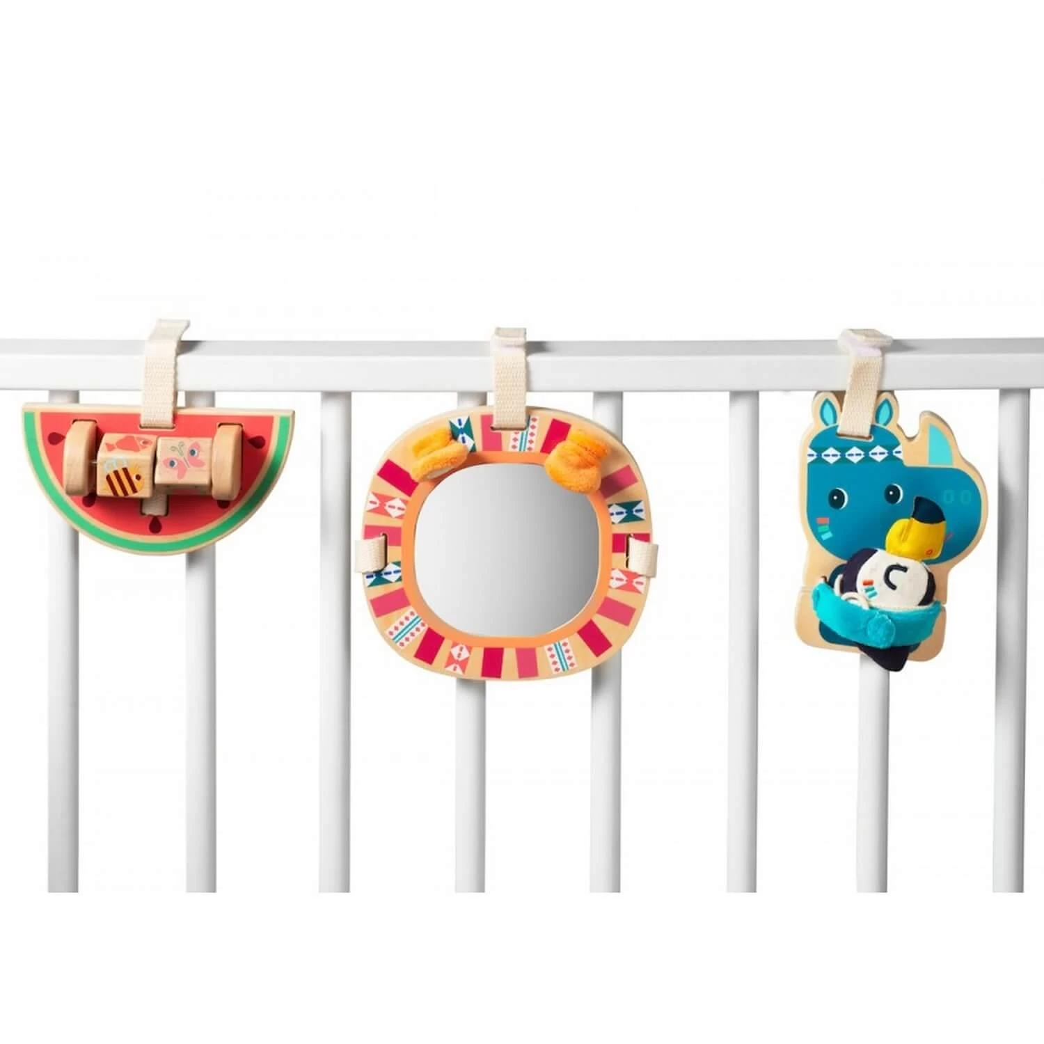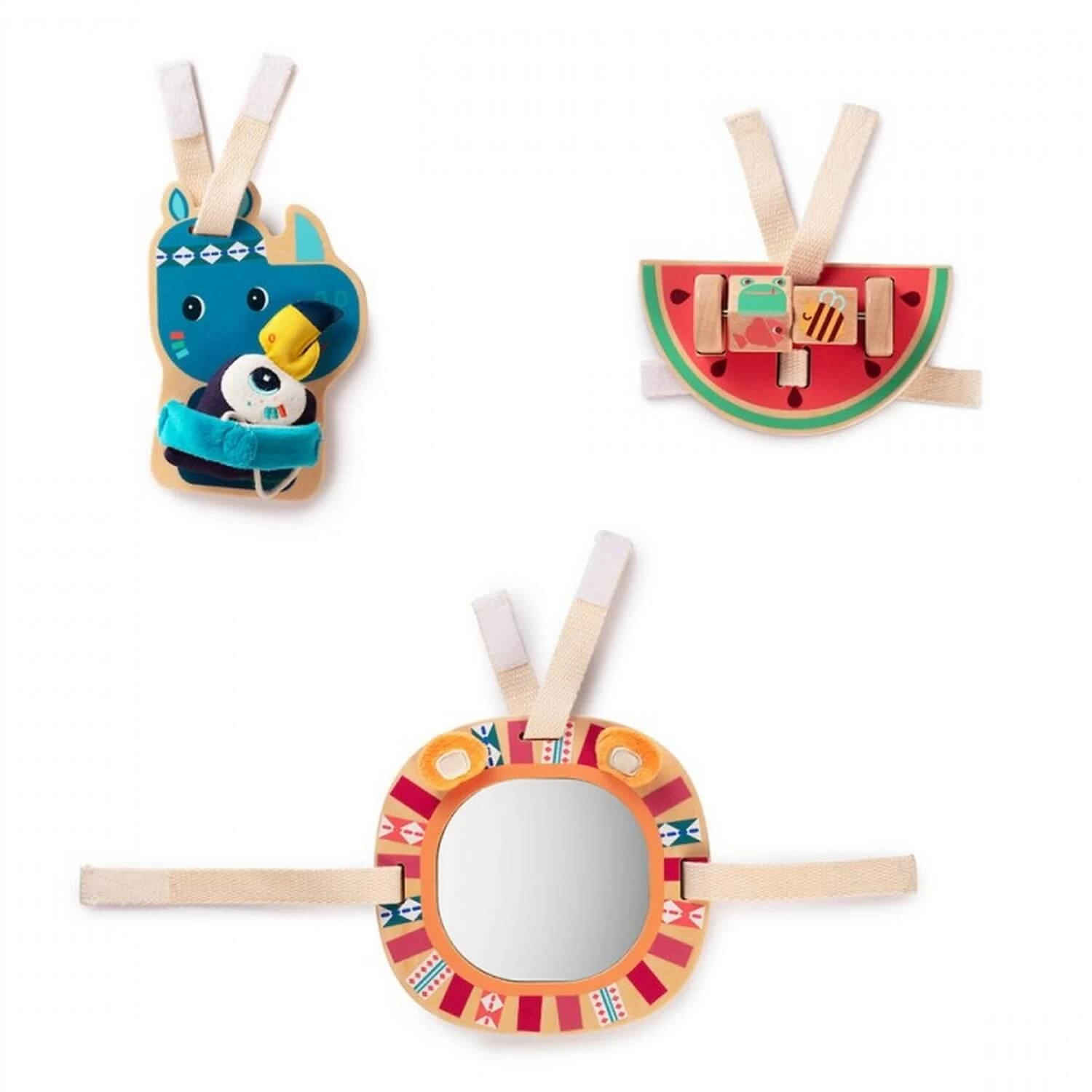 Le set est constitué de 3 éléments indépendants qui se fixent aisément au parc de bébé ou sur tout autre type de support. Des rubans adhésifs permettent de fixer les différents éléments du set n’importe où.