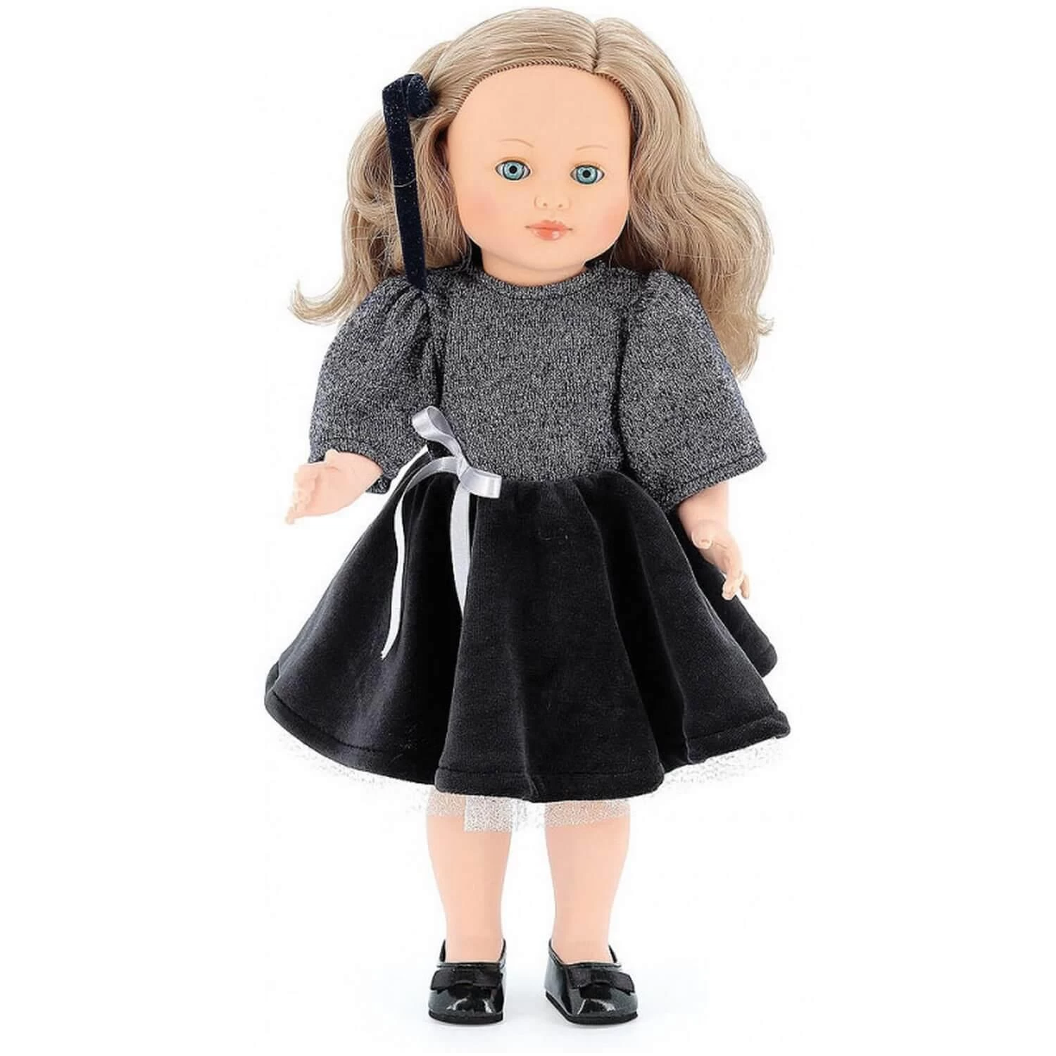 Poupée Marie-Françoise 40 cm avec habillage “Violet”. Corps et membres en polyéthylène finition satinée et tête en vinyle souple. Yeux dormeurs bleus avec cils et cheveux longs blonds. La tenue se compose d’une robe noire et grise et de chaussures noires.