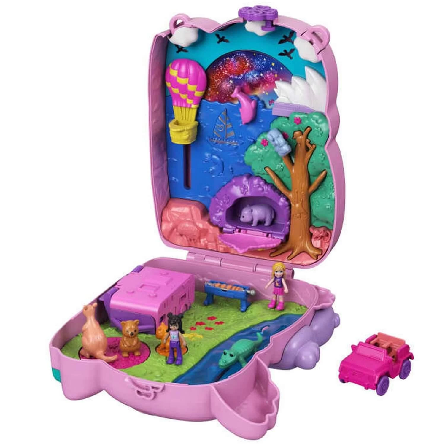 Le coffret comprend aussi 5 figurines d’animaux (maman et bĂ©bĂ© koala, kangourou, wombat et quokka). Les filles peuvent rejoindre le camp en voiture et trouveront dans le camping-car qui s’ouvre : de la nourriture, un coin couchage et un coin repas. Il y a mĂŞme un barbecue qui se dĂ©plie pour prĂ©parer un dĂ©licieux repas ! Faites tourner le wombat pour voir le kangourou sauter et faites jouer tous les animaux ensemble ! Mais gare au crocodile dans la rivière. Le mieux est d’accrocher la maman koala et son bĂ©bĂ© dans l’arbre et d’ouvrir le buisson pour que le wombat s’y repose ! Admirez la vue sur le port de Sydney depuis la montgolfière ou faites tourner le dauphin pour changer de dĂ©cor ! Quoi de plus amusant que le bush australien !Â