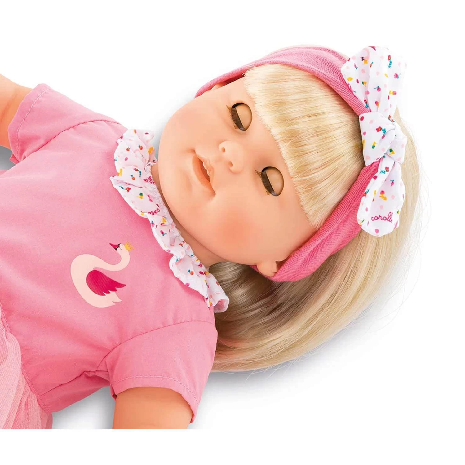 Son visage, ses bras et ses jambes, à la délicate senteur de vanille, sont en vinyle doux au toucher. Son corps est souple pour faciliter ses mouvements et elle tient assise. Avec ses yeux dormeurs, elle fait dodo quand on la couche sur le dos.