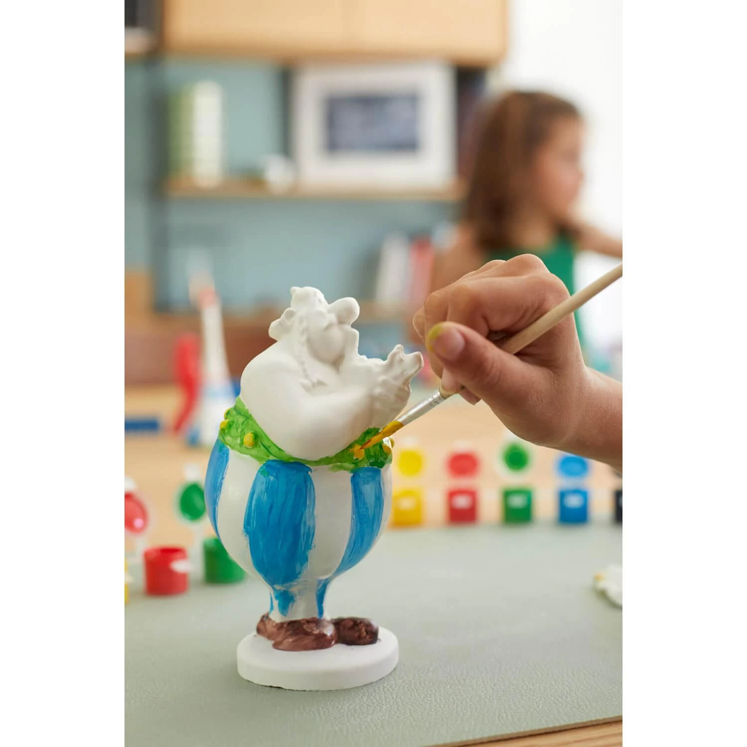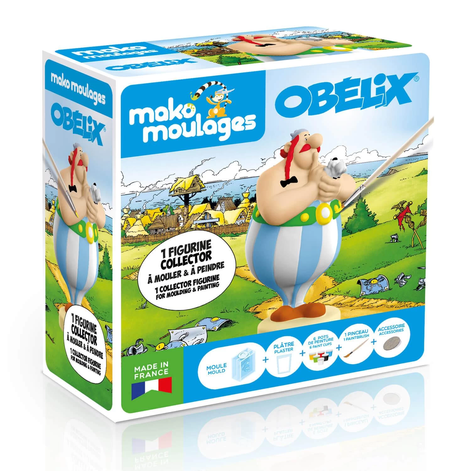 Ce coffret créatif vous permet de reproduire votre personnage préféré Obélix de A à Z : préparez le plâtre, moulez puis démoulez le personnage et peignez-le aux couleurs de son fameux pantalon à rayures, parfait pour jouer ou décorer une pièce !