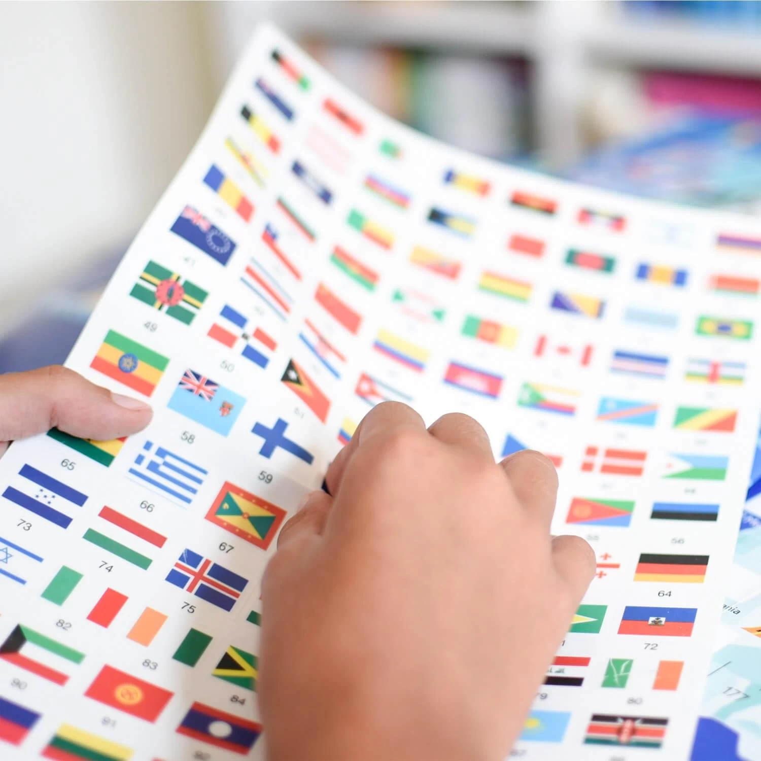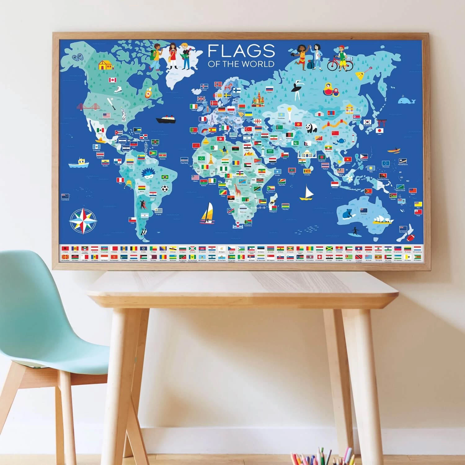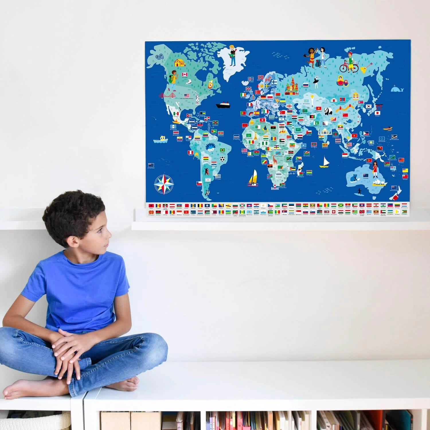 Avec ce kit, les enfants se passionnent pour les drapeaux du monde. Ils collent chaque drapeau au bon emplacement sur le grand poster, et mémorisent ainsi la géographie. Une belle affiche pour la chambre !