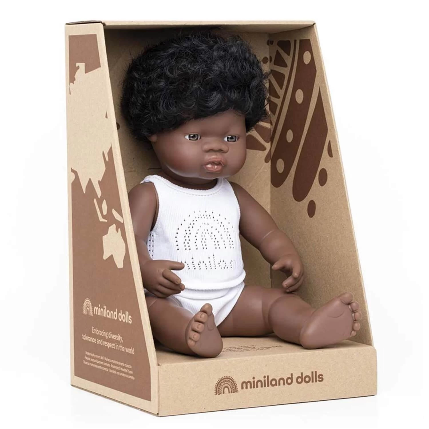 Cette poupée garçon africain, fait partie de la collection Miniland Dolls, qui promeut des valeurs d’égalité et de diversité.