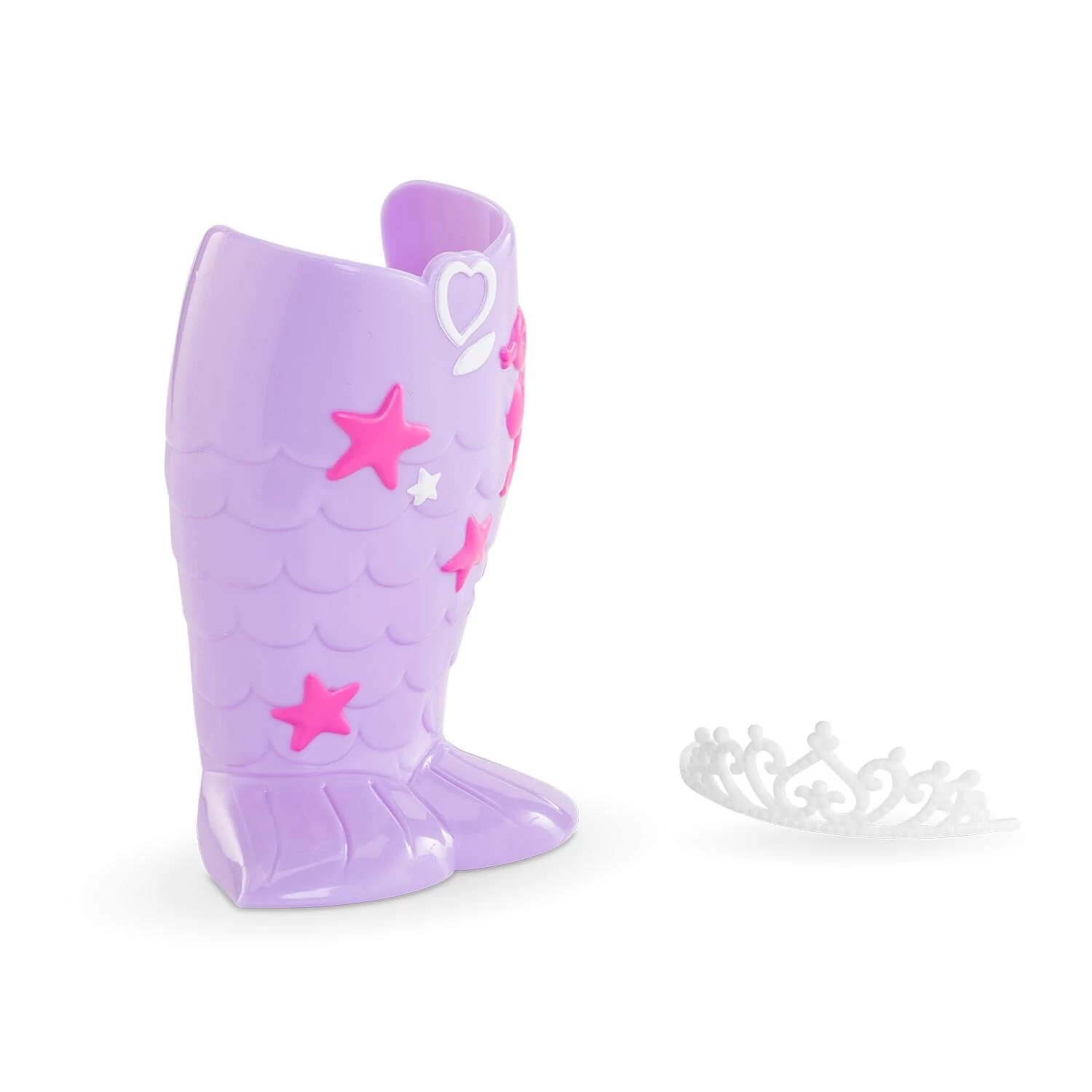 Elle est habillée d’un maillot de bain deux pièces scintillant et est coiffée d’un diadème. Pour la transformer en sirène : rien de plus simple : il suffit de clipser sa demi-queue sur ses jambes.