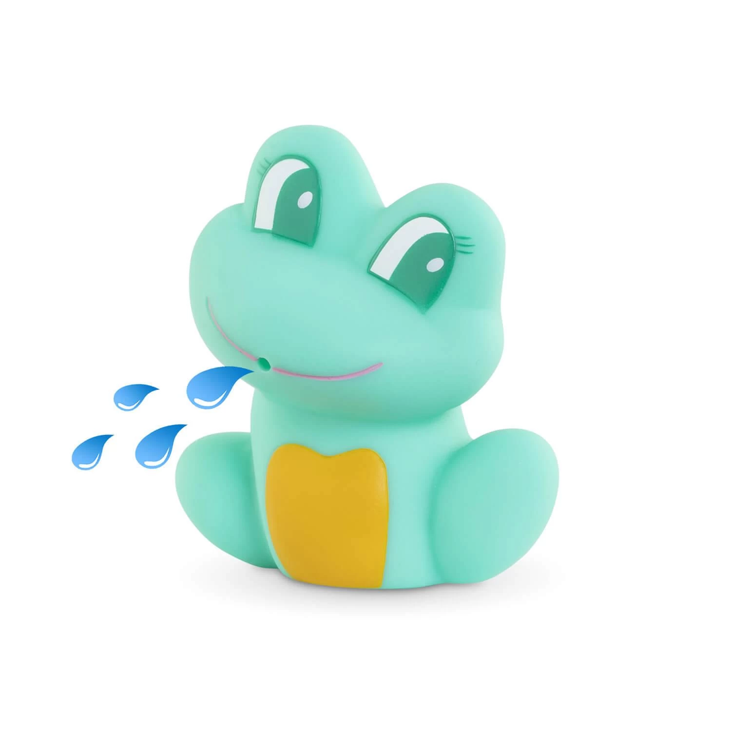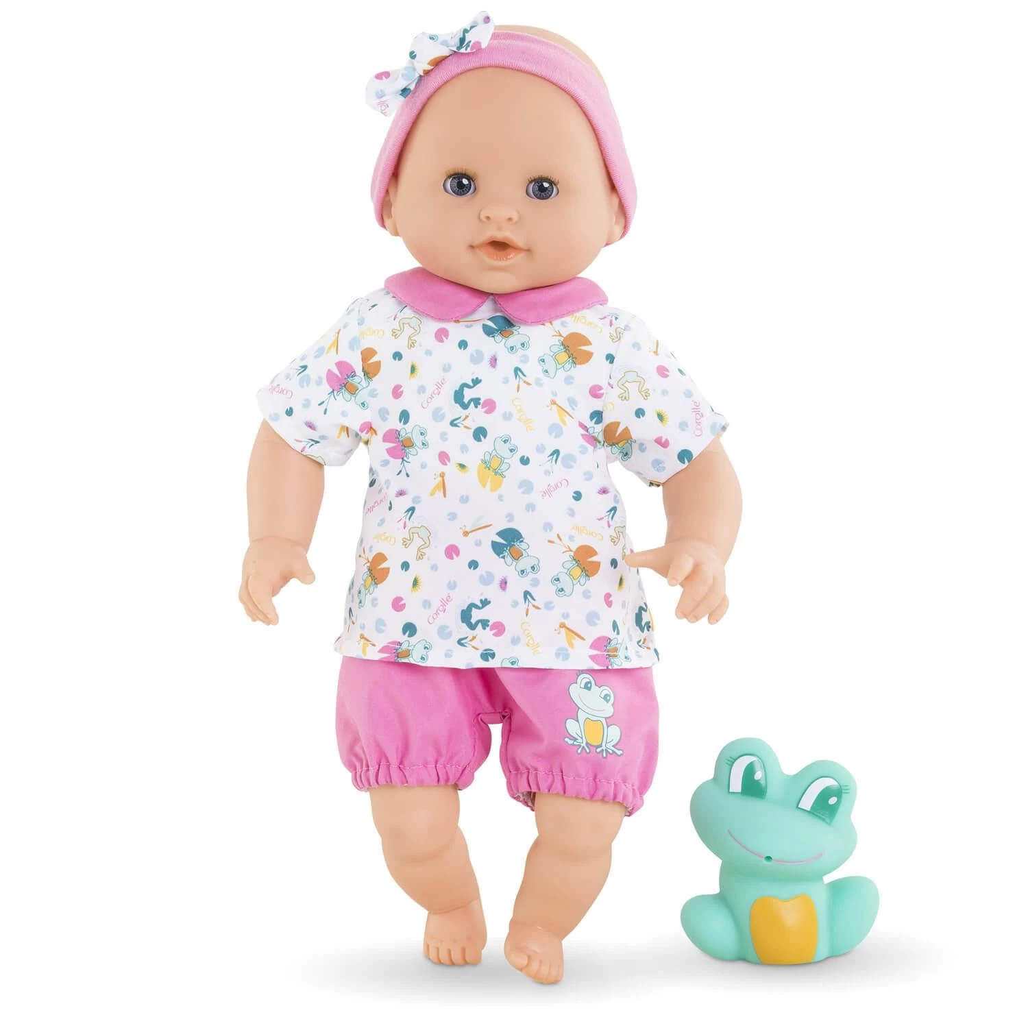 Il est habillé d’une blouse et d’un short et coiffé d’un bandeau assorti. Il est livré avec une grenouille de bain qui crache de l’eau quand on appuie dessus après l’avoir immergée.
