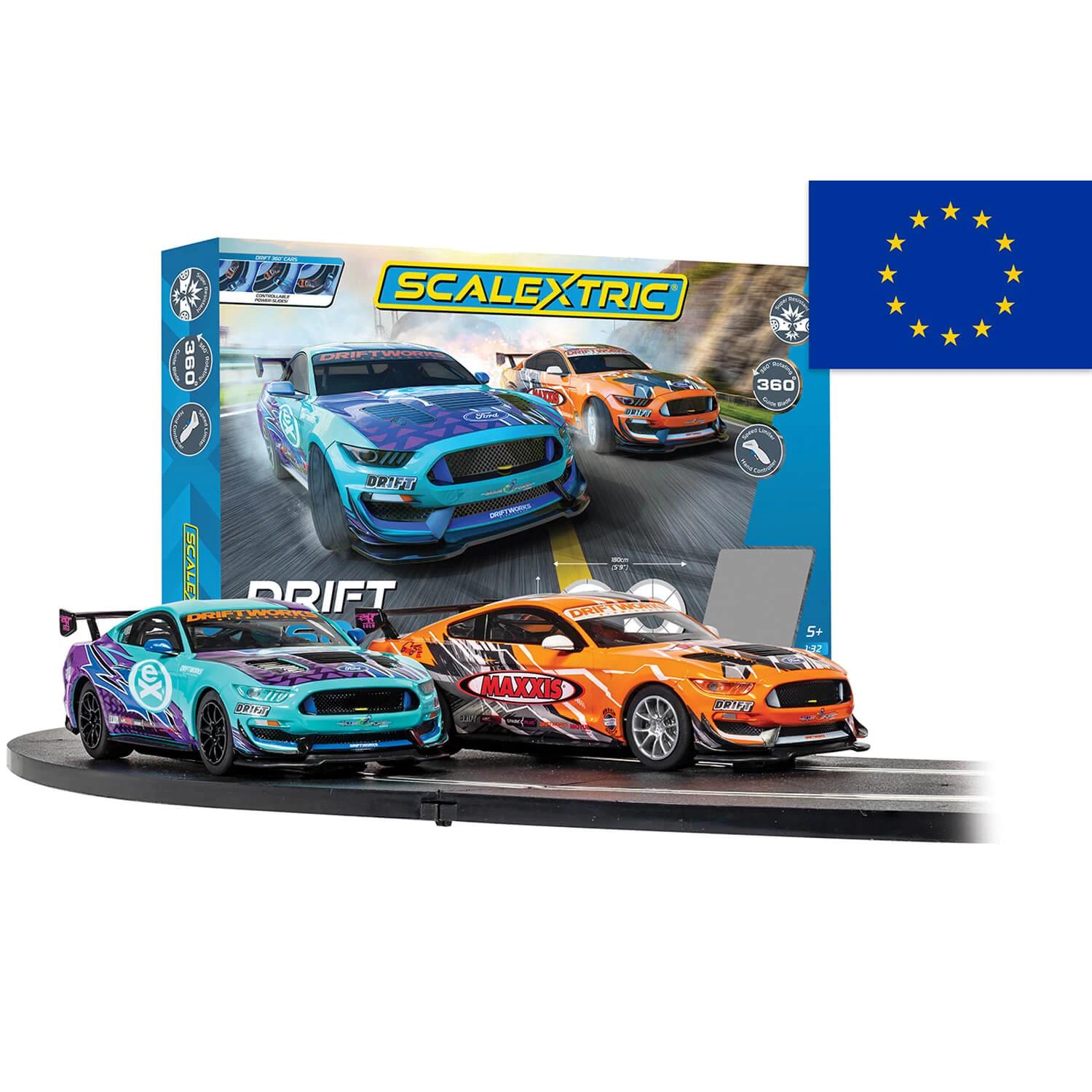 Ce fantastique circuit de voitures Drift 360 Race comprend deux voitures un modèle Extreme Ford Mustang GT4, et un modèle Maxxis Ford Mustang GT4 qui vont s’affronter sur plus de 3m de piste et peuvent effectuer des mouvements à 360° pour contrer leur adversaire. Apportez à la maison l’intensité des crissements de roues et la vitesse de ces voitures aujourd’hui ! Démarrez votre carrière de pilote avec Scalextric !