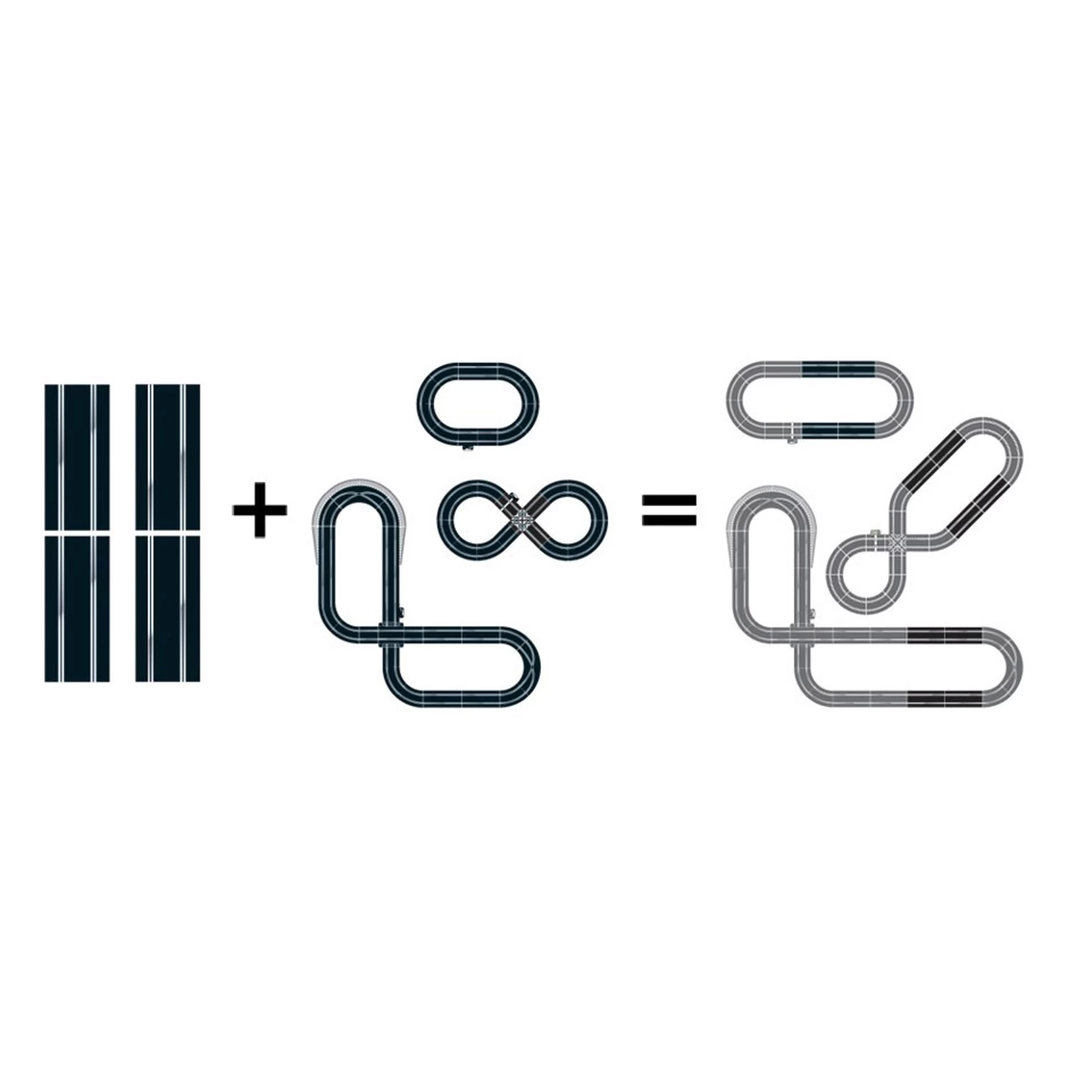 En rajoutant ces 4 rails droits, vous avez l’opportunité d’agrandir votre circuit de base de 1,4 mètres au total ce qui vous permet d’élaborer toutes sortes de formes de circuit. Vous n’avez plus qu’à y placer vos plus performantes voitures de course et à lancer le départ !