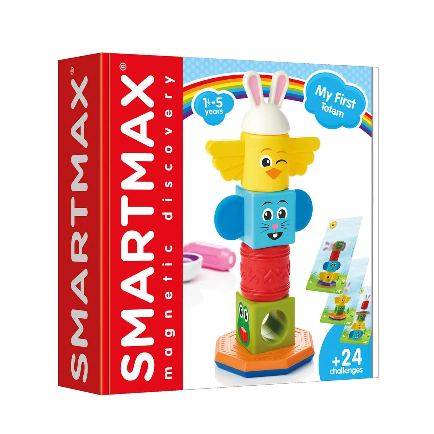 Construisez votre propre totem ! Laissez libre cours à votre créativité avec SmartMax My First Totem. Créez votre propre totem ou amusez-vous en reconstituant les totems proposés sur les 24 fiches défis. Grùce aux piÚces extra-larges de SmartMax, les jeunes enfants découvrent la magie du magnétisme en toute sécurité. SmartMax My First Totem contient 8 piÚces et 24 fiches défis et convient aux enfants à partir de 18 mois. Toutes les piÚces diffÚrent les unes des autres : blocs aimantées, formes sonores, figures bifaces et textures variées.