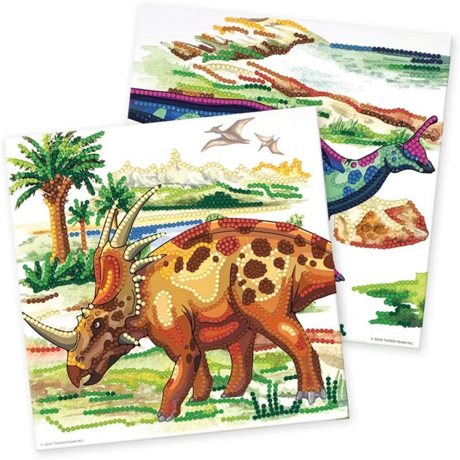 Retrouvez un coffret créatif complet sur le thème des dinosaures. Votre enfant va pouvoir s’amuser à réaliser 2 tableaux étincelants et colorés sur les dinosaures ! Il pourra ainsi coller des micro strass à l’aide d’un applicateur spécial sur les modèles. Le but étant de suivre les nombres associés à chaque couleur.
