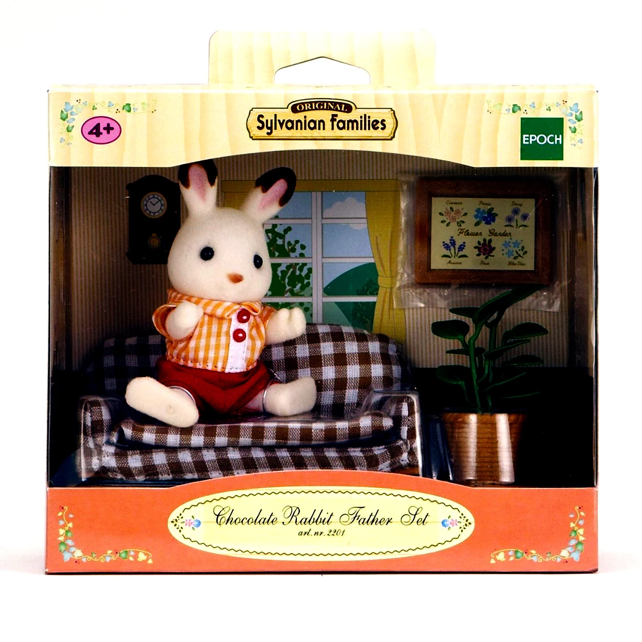 Equipement de base de la maison Sylvanian, ce salon comprend : 1 canapé, 1 cadre mural, 1 plante verte ainsi que la figurine Papa Lapin Chocolat.