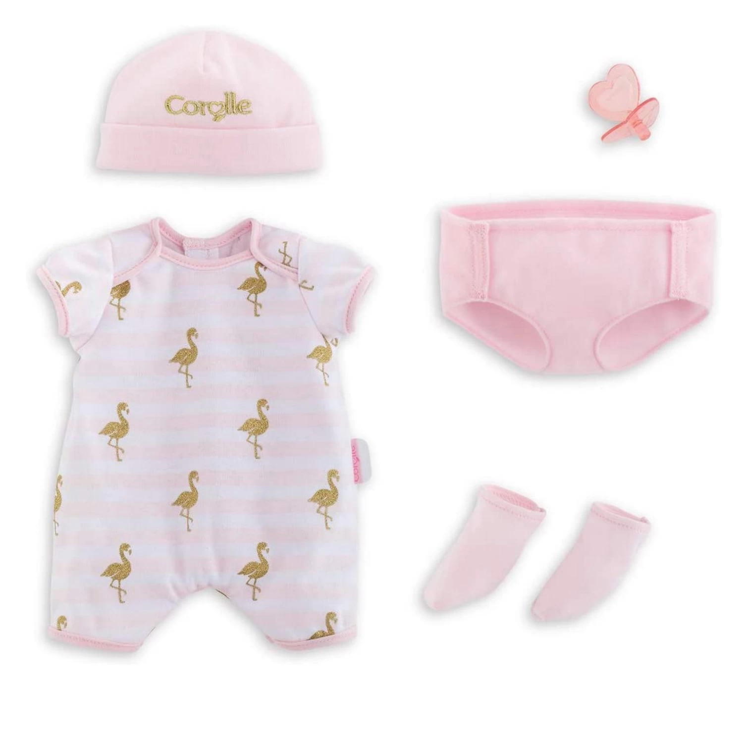 Le trousseau de naissance est indispensable pour les grands poupon de 36cm. Il contient un body à manchez courtes, un bonnet de naissance assorti, une paire de chaussettes, une couche en tissu et une tétine. Confectionné dans des matières douces et résistantes, le body est facile à enfiler grâce aux bandes auto-agrippantes, adaptées à la dextérité des petites mains.