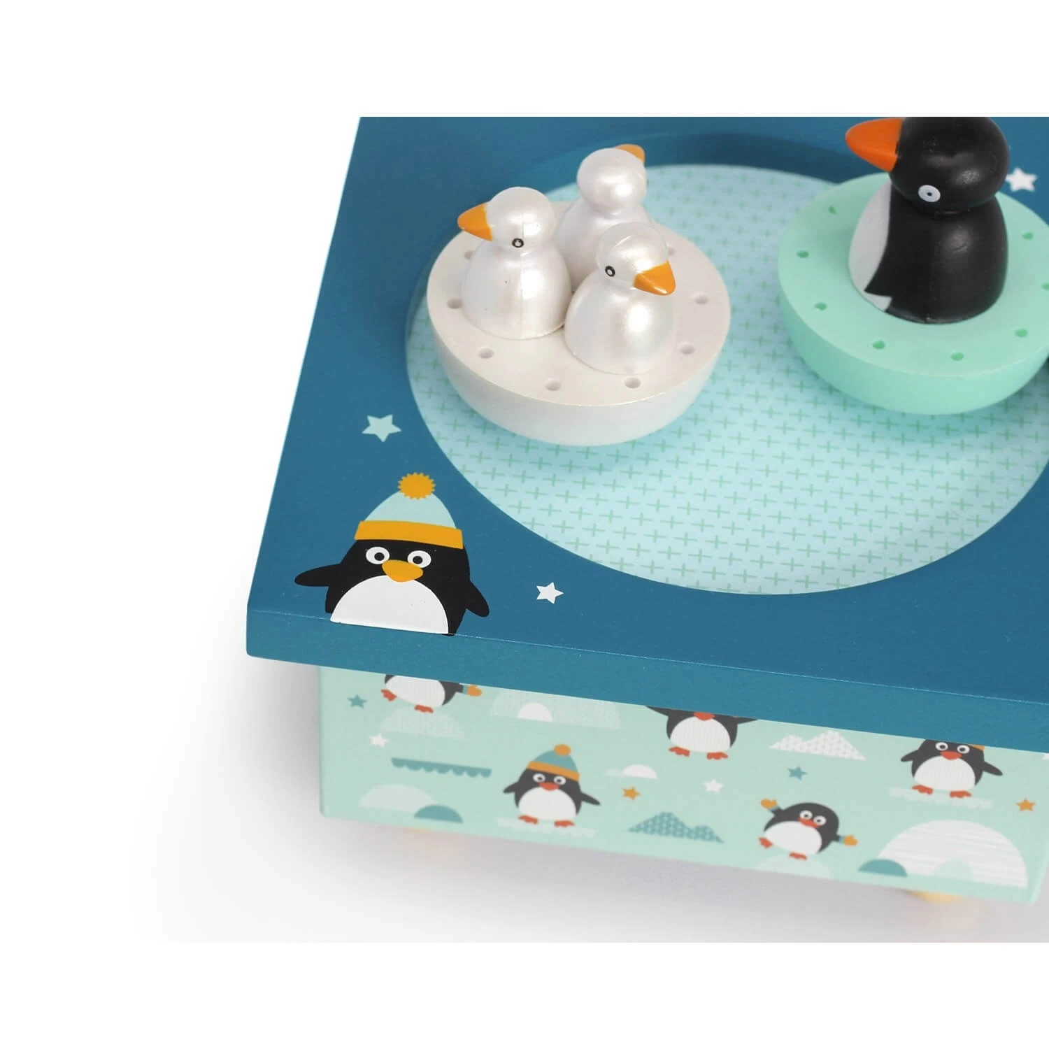 La boîte à musique est joliment décorée de couleurs douces et de petits pingouins. Le mécanisme en métal est manuel. Il suffit de faire tourner la manivelle pour que les personnages équipés d’aimants se mettent à tournoyer sur la piste de danse le temps de la mélodie.