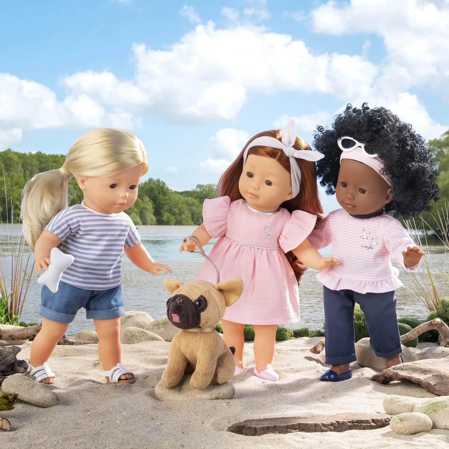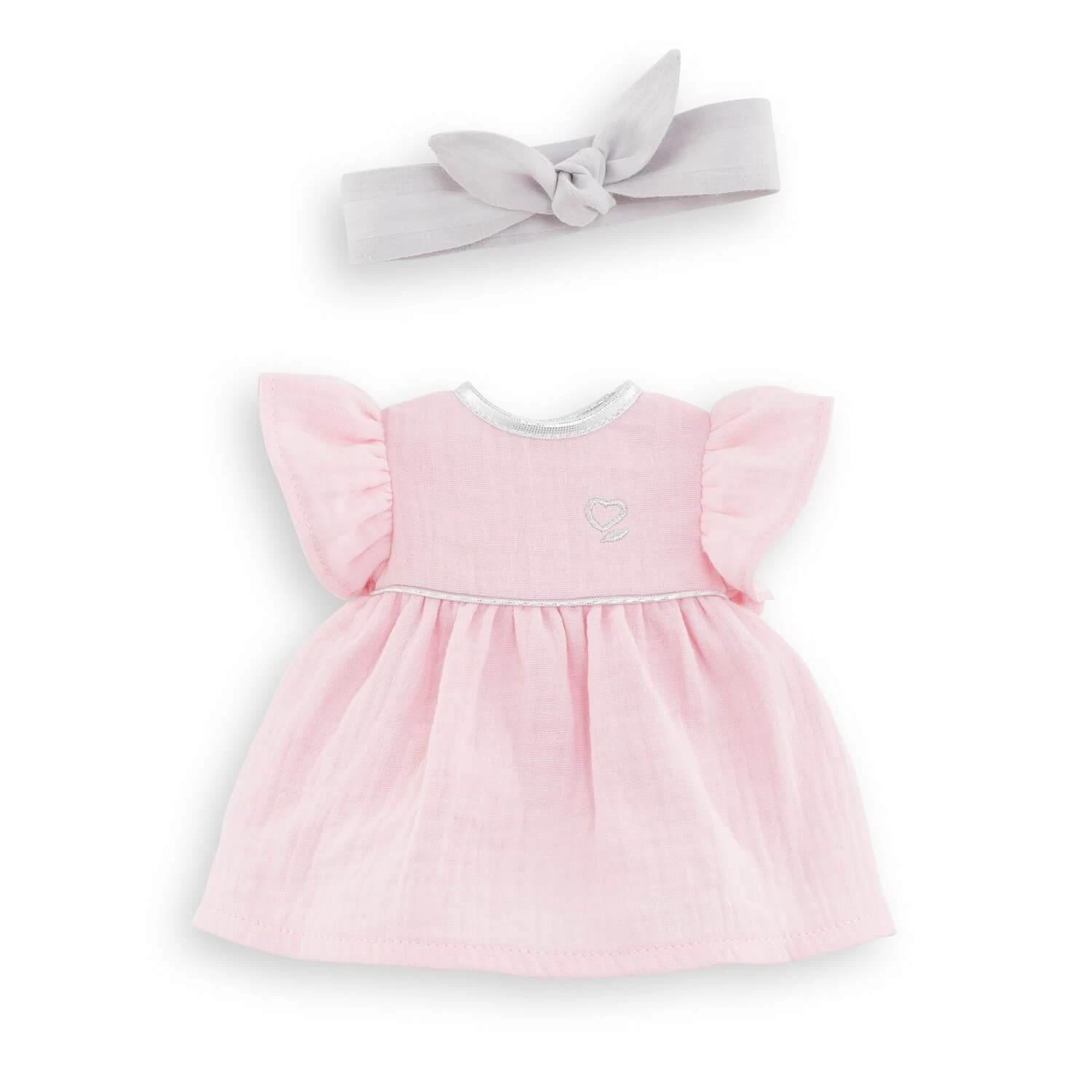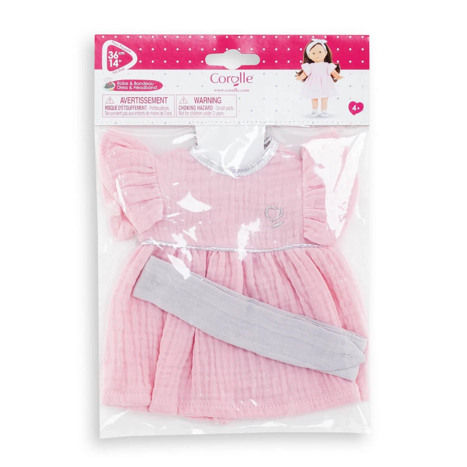 Cette tenue complète pour les poupées ma Corolle de 36 cm se compose d’une robe rose, effet gaze de coton, et d’un bandeau nœud gris clair. La robe est délicatement ornée d’un col et d’une ceinture argentés, et d’une broderie “cœur Corolle” sur le devant.