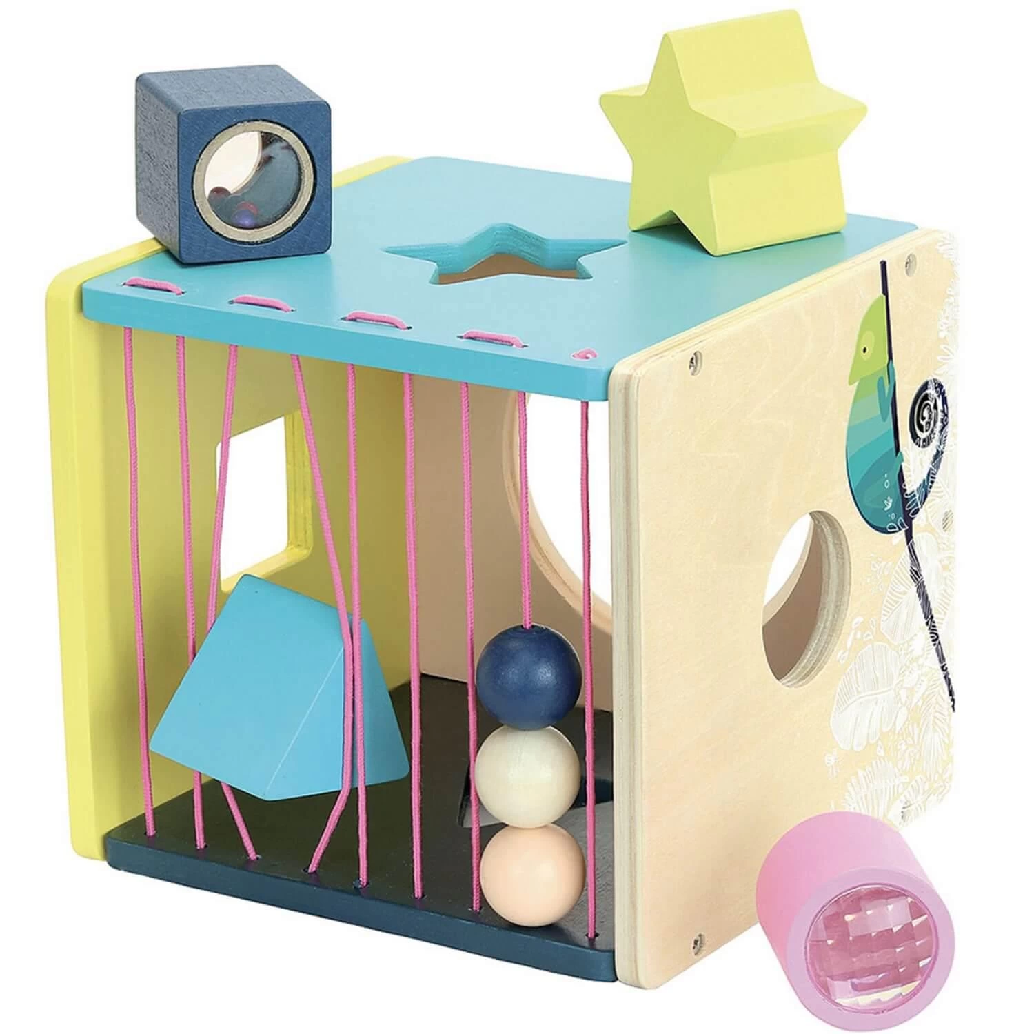 Le petit plus ? Toutes les formes ont une deuxième fonctionnalité ! Le cylindre est un kaléidoscope, le cube est une maraca et le triangle est sonore.