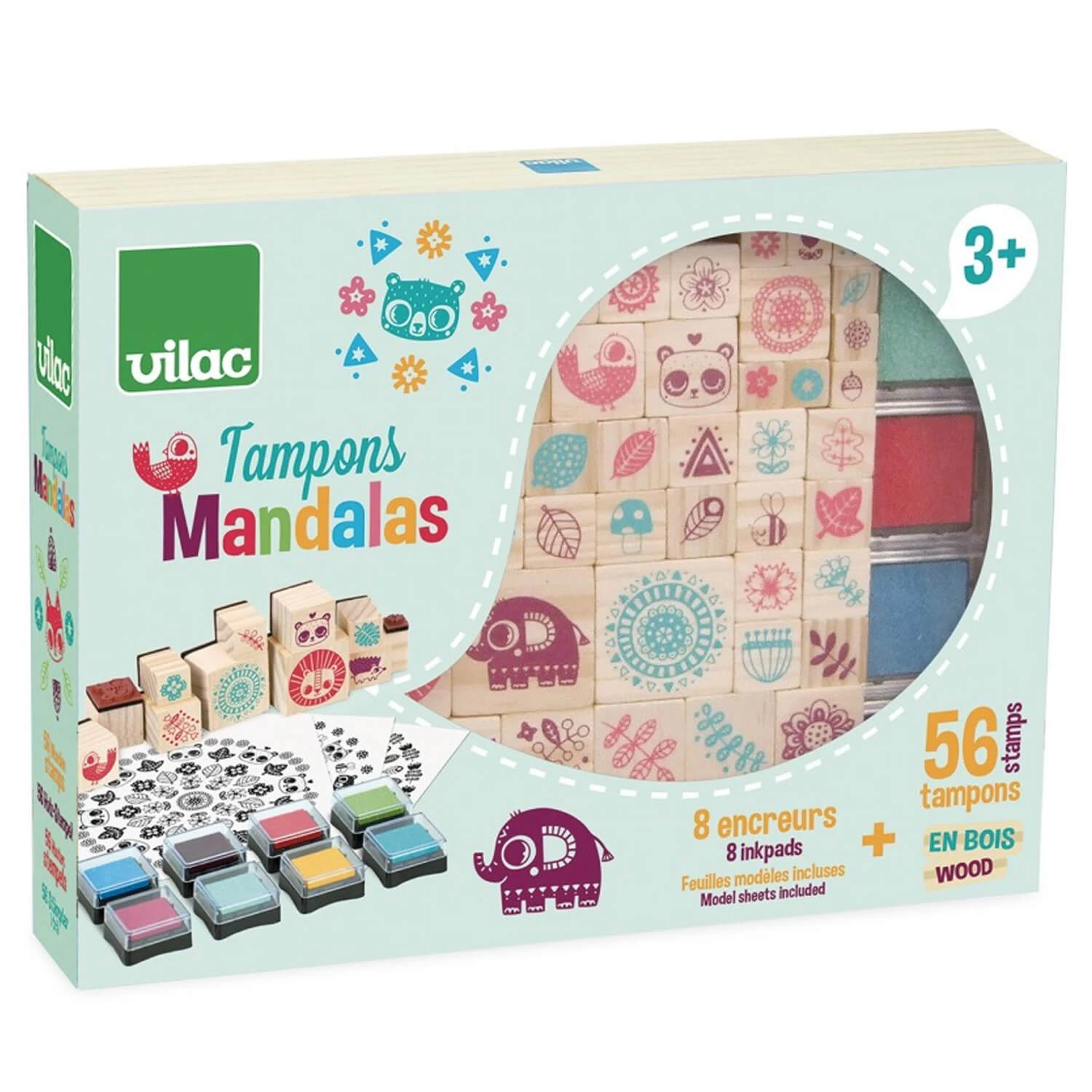 Pour cela, le coffret contient 56 tampons en bois et 8 encreurs avec les couleurs primaires rouge, bleu, vert, jaune et quatre autres couleurs complémentaires pour des mandalas en différents coloris.