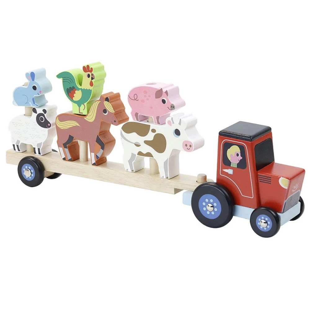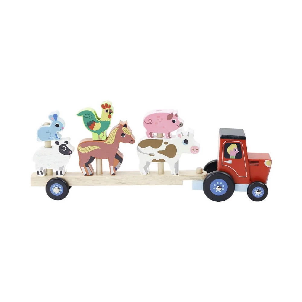 Si votre enfant adore les animaux de la ferme et adore jouer à empiler, cet ensemble est fait pour lui. Il se compose de jolis animaux en bois à empiler sur la remorque du tracteur, ainsi la vache, le cheval, le cochon … rentrent rapidement à la ferme ! Ils pourront jouer avec les animaux de la ferme et ensuite amener tout le monde à l’écurie grâce à la remorque magique du tracteur.