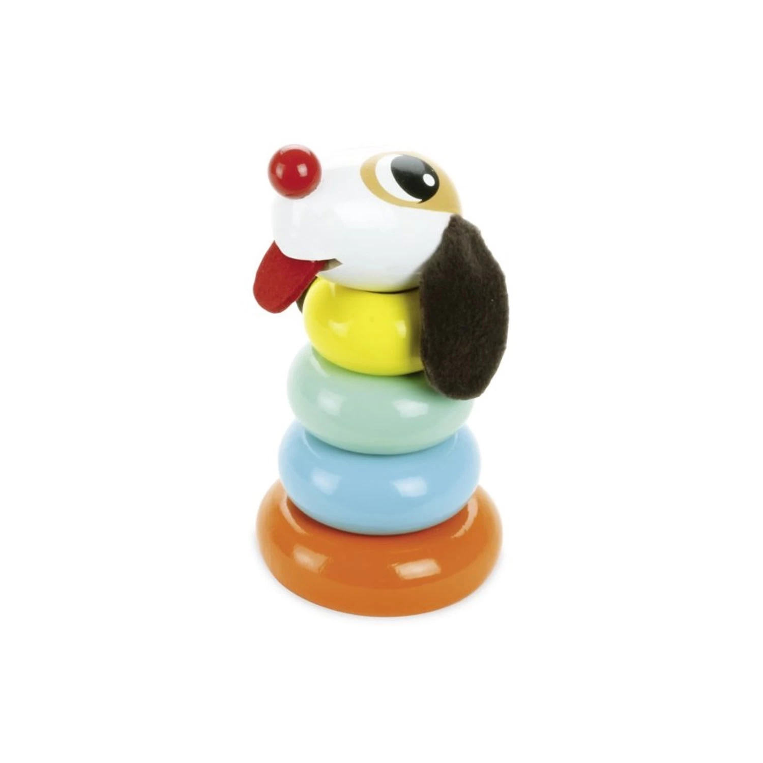Une fois les anneaux empilés, les enfants seront ravis de mettre au sommet de leur pyramide la tête amusante de ce petit chien aux longues oreilles et à la langue tirée ! Lui, il a le droit…