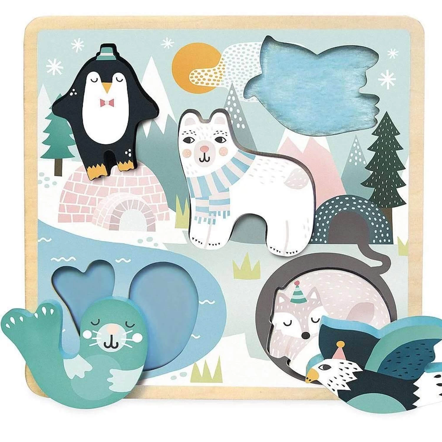 Un jeu d’encastrement en bois tactile avec 5 pièces en forme d’adorables animaux sur le thème de la banquise.