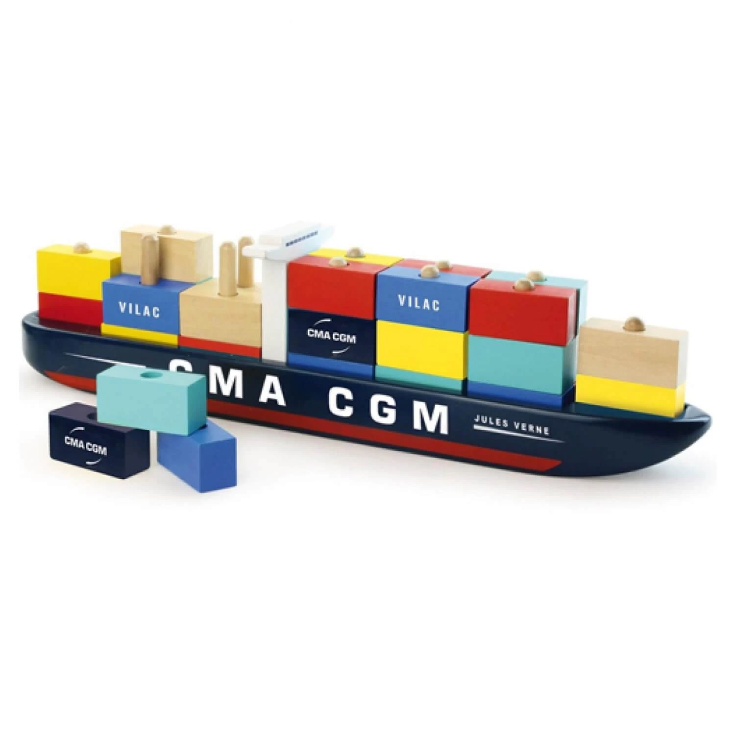 Préparez la cargaison de ce porte-container en empilant les cubes de bois et voguez sur l’apprentissage de la motricité fine avec ce joli bateau en bois de la marque Vilac !