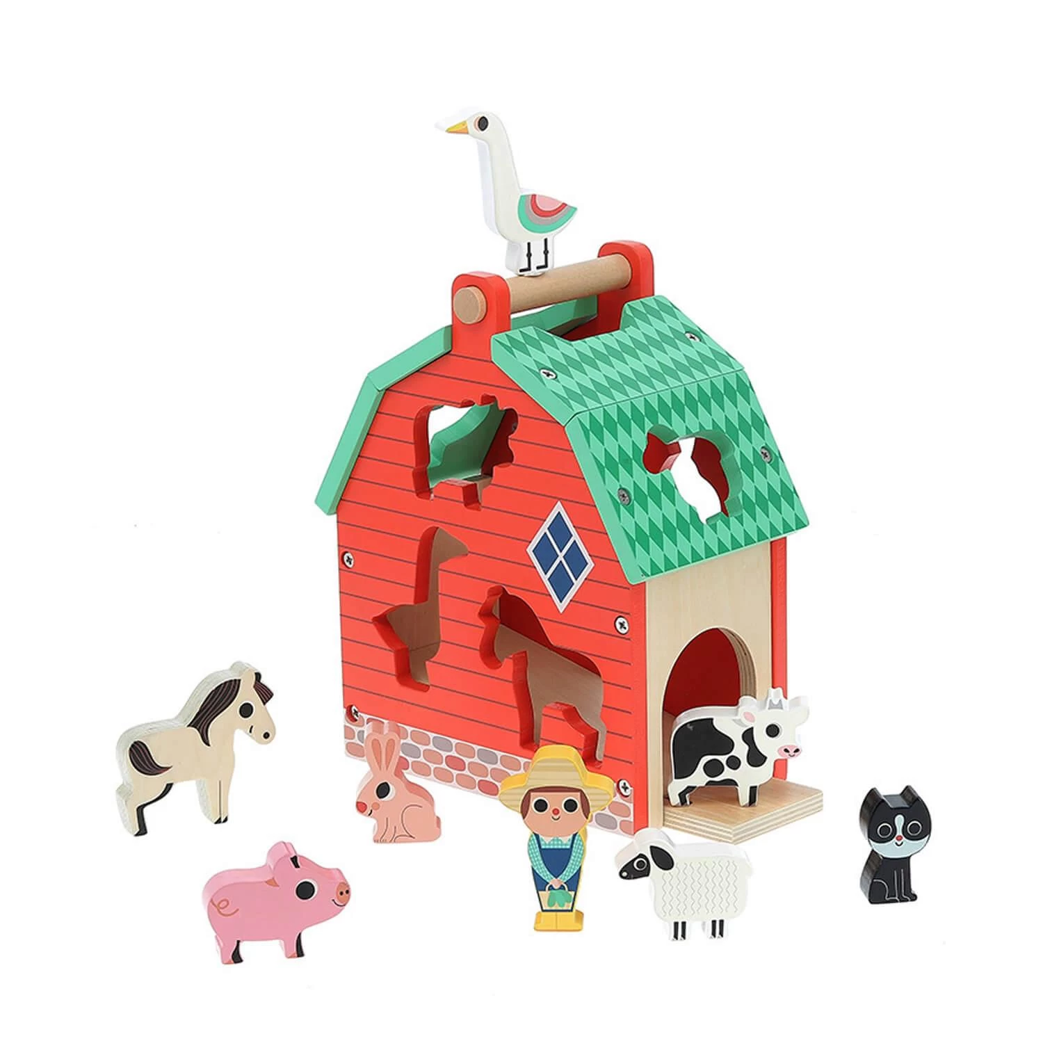 Bienvenue à la ferme des formes, de la marque Vilac et imaginée par l’illustratrice Ingela P.Arrhenius, où vous retrouverez huit personnages en bois à encastrer !