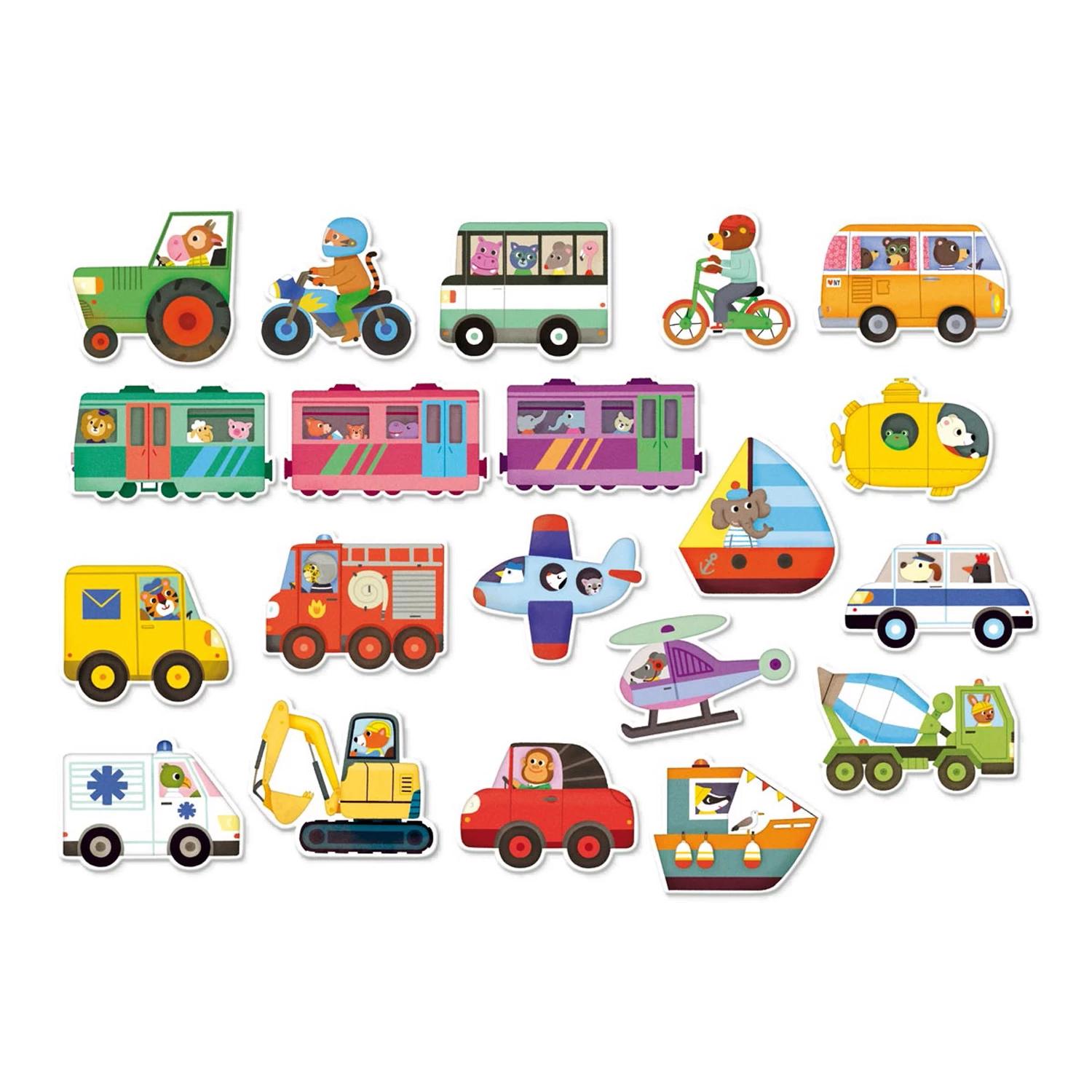 Pour cela, parmi les 20 pièces représentées, vous y trouverez notamment un tracteur, une moto, un bus, un train, un avion, un voilier, un hélicoptère et bien d’autres véhicules.