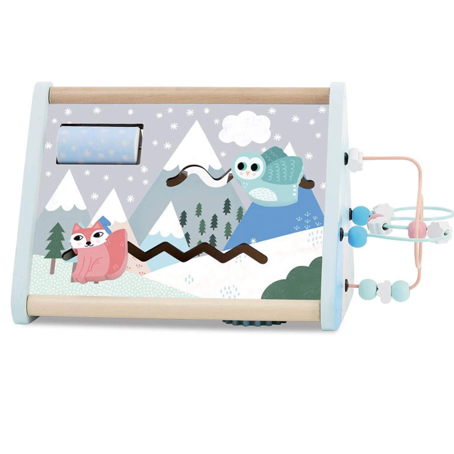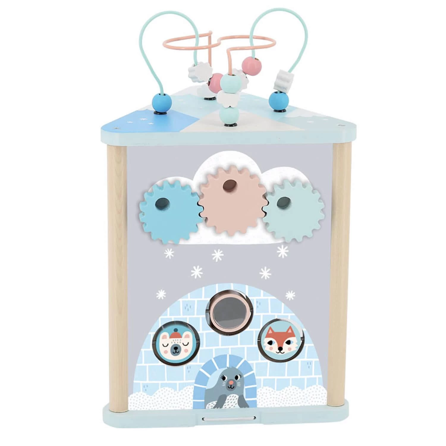 Que de choses à découvrir : des engrenages à actionner, des petites têtes à pivoter, un hibou et un renard à faire voyager, un cylindre de neige à faire tourner et des perles et nuages à déplacer sur un fil ! Dans l’igloo de l’ours, une petite porte latérale avec des charnière élastiques permet à l’enfant de récupérer les pièces qu’il aura encastrées sur un des côtés.